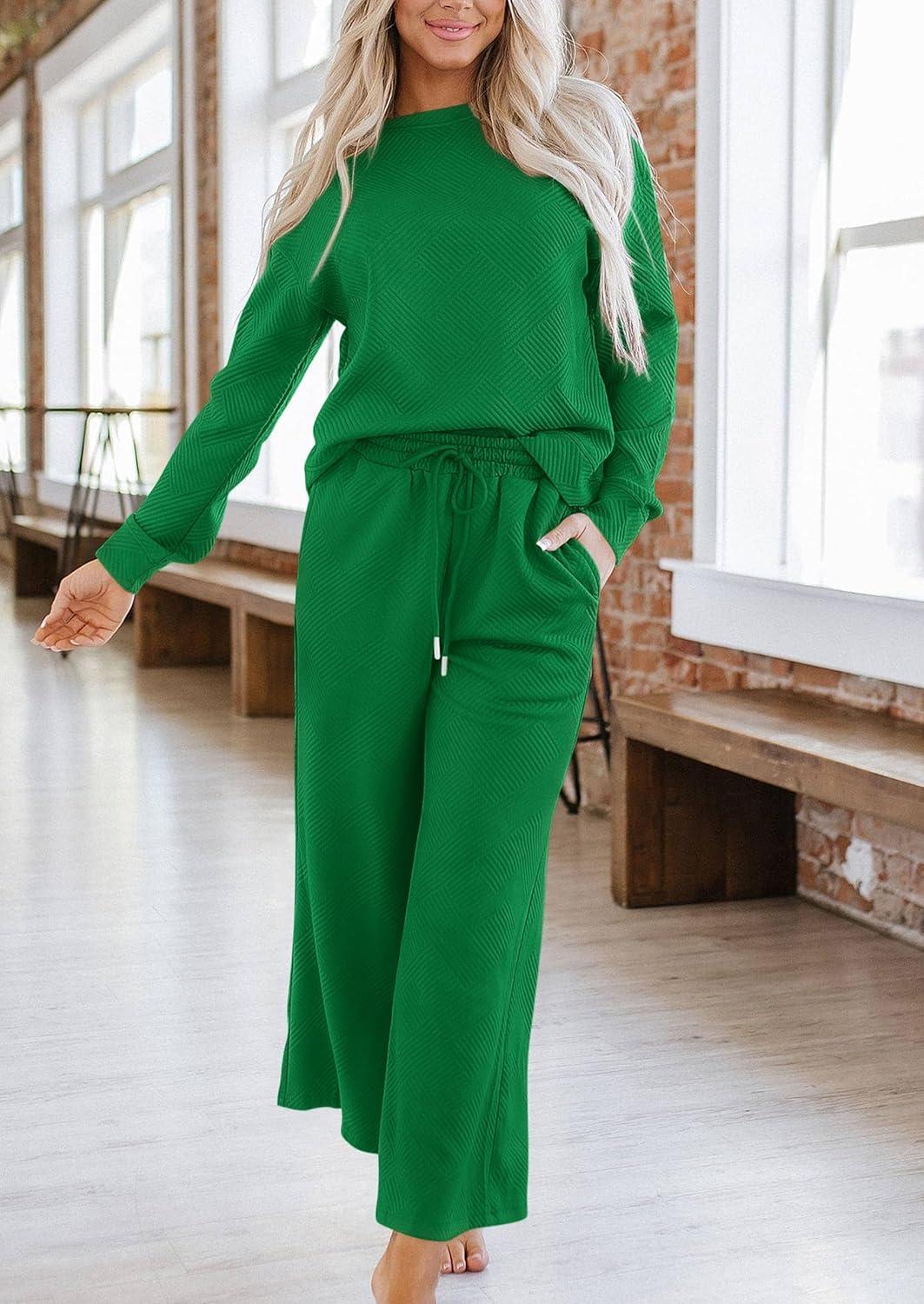 PRETTYGARDEN Womens 2025 Fall 2 Piece Outfits Long Sleeve Pullover Tops Wide Leg Pants Matching Lounge Sets Fashion Clothing(Green)