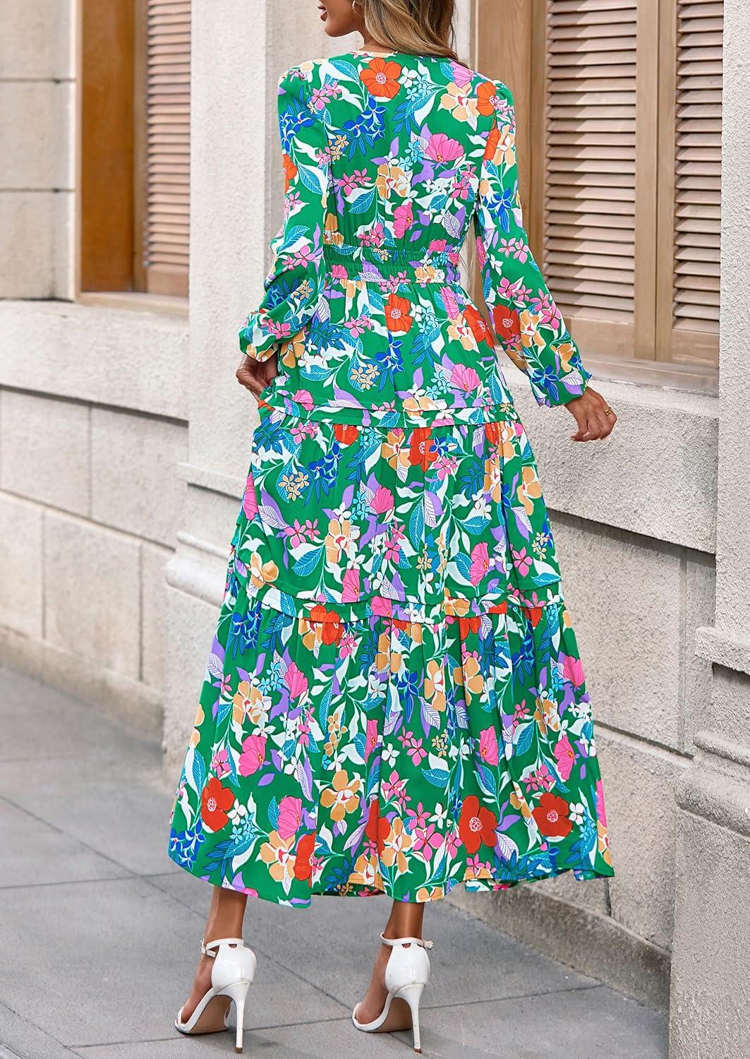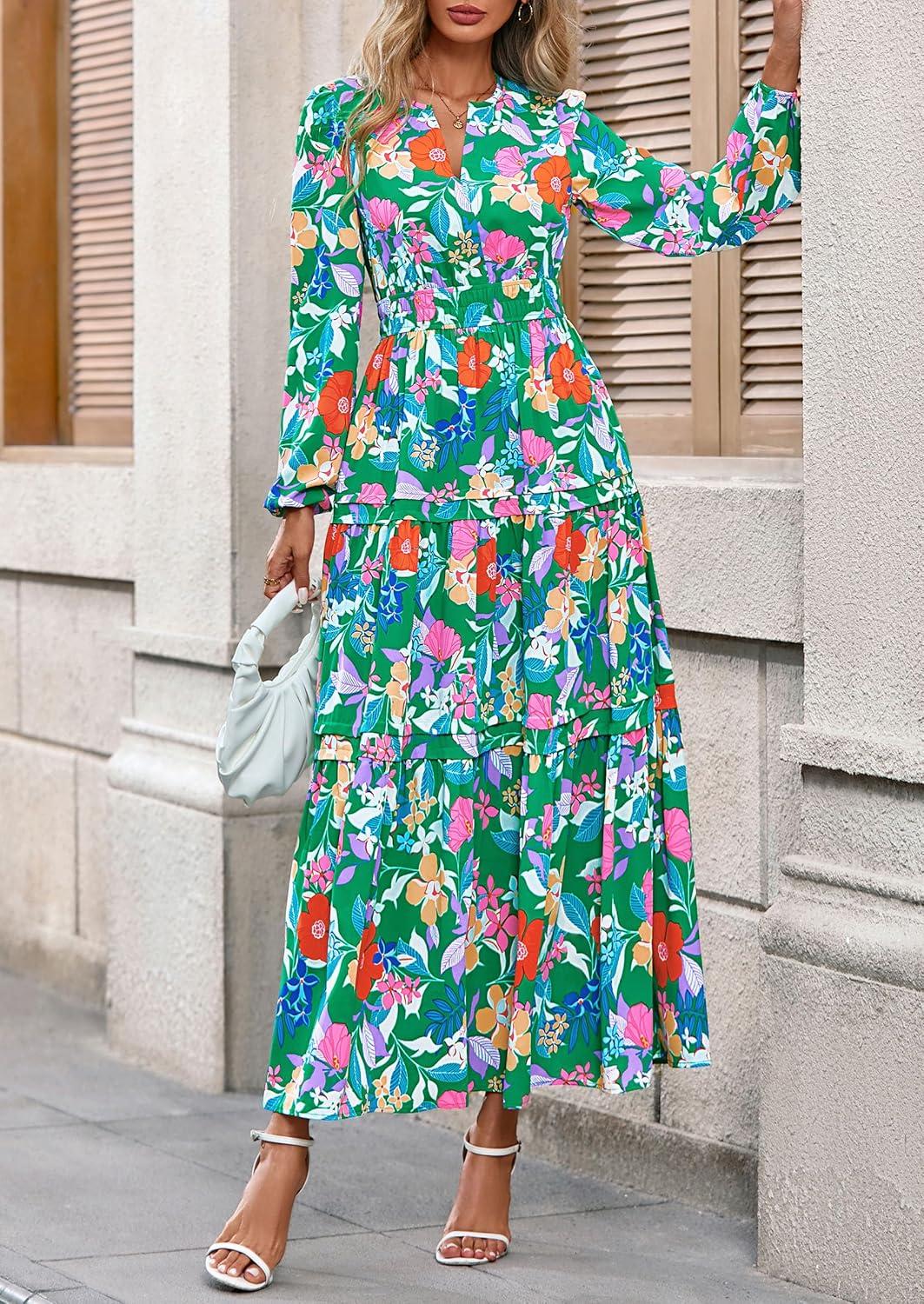 PRETTYGARDEN Women's 2025 Fall Boho Maxi Dresses Floral Long Sleeve V Neck Flowy Elegant Wedding Guest Dress Vacation Outfits(Floral Green Orange)