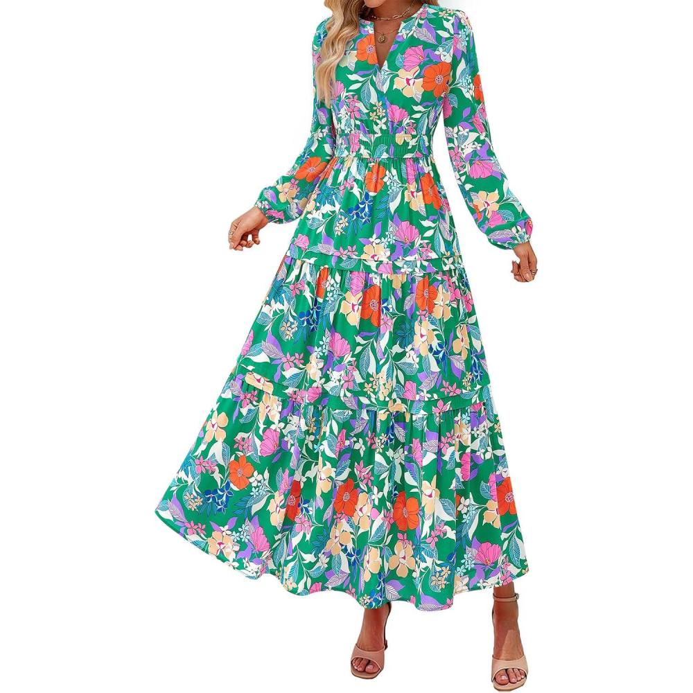 PRETTYGARDEN Women’s 2025 Fall Boho Maxi Dresses Floral Long Sleeve V Neck Flowy Elegant Wedding Guest Dress Vacation Outfits(Floral Green Pink)