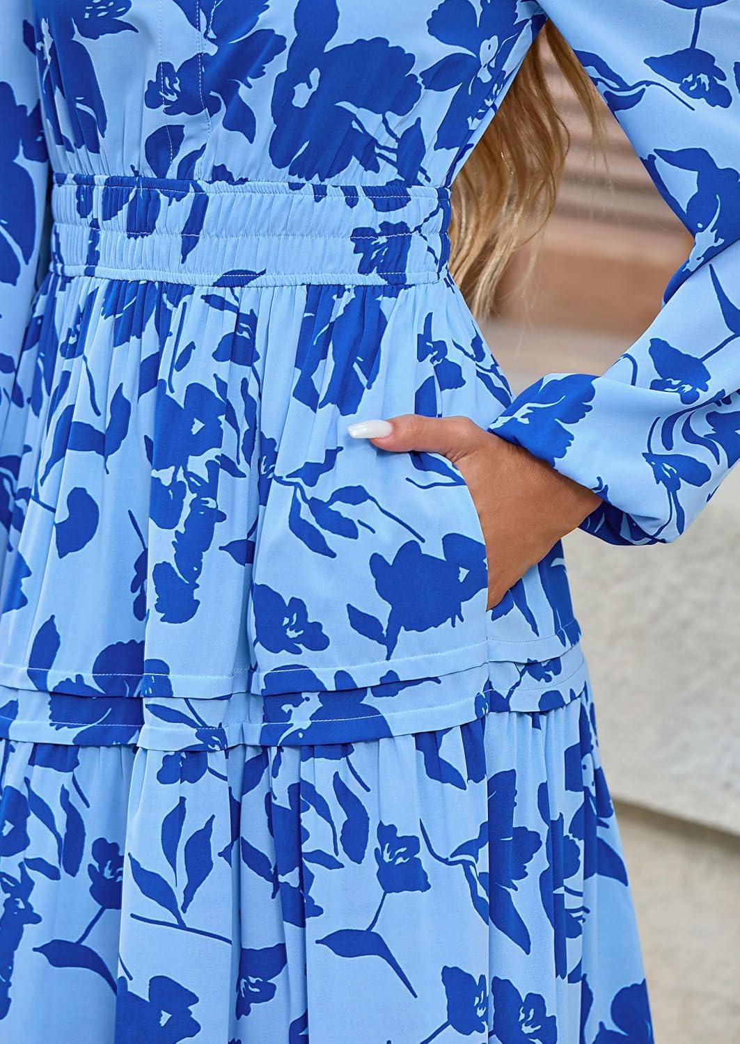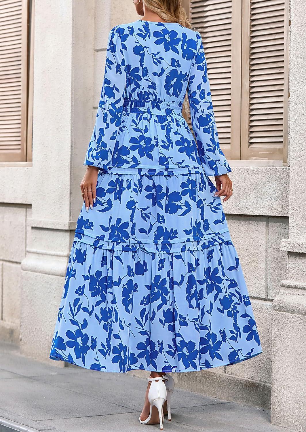 PRETTYGARDEN Women's 2025 Fall Boho Maxi Dresses Floral Long Sleeve V Neck Flowy Elegant Wedding Guest Dress Vacation Outfits(Sky Blue)