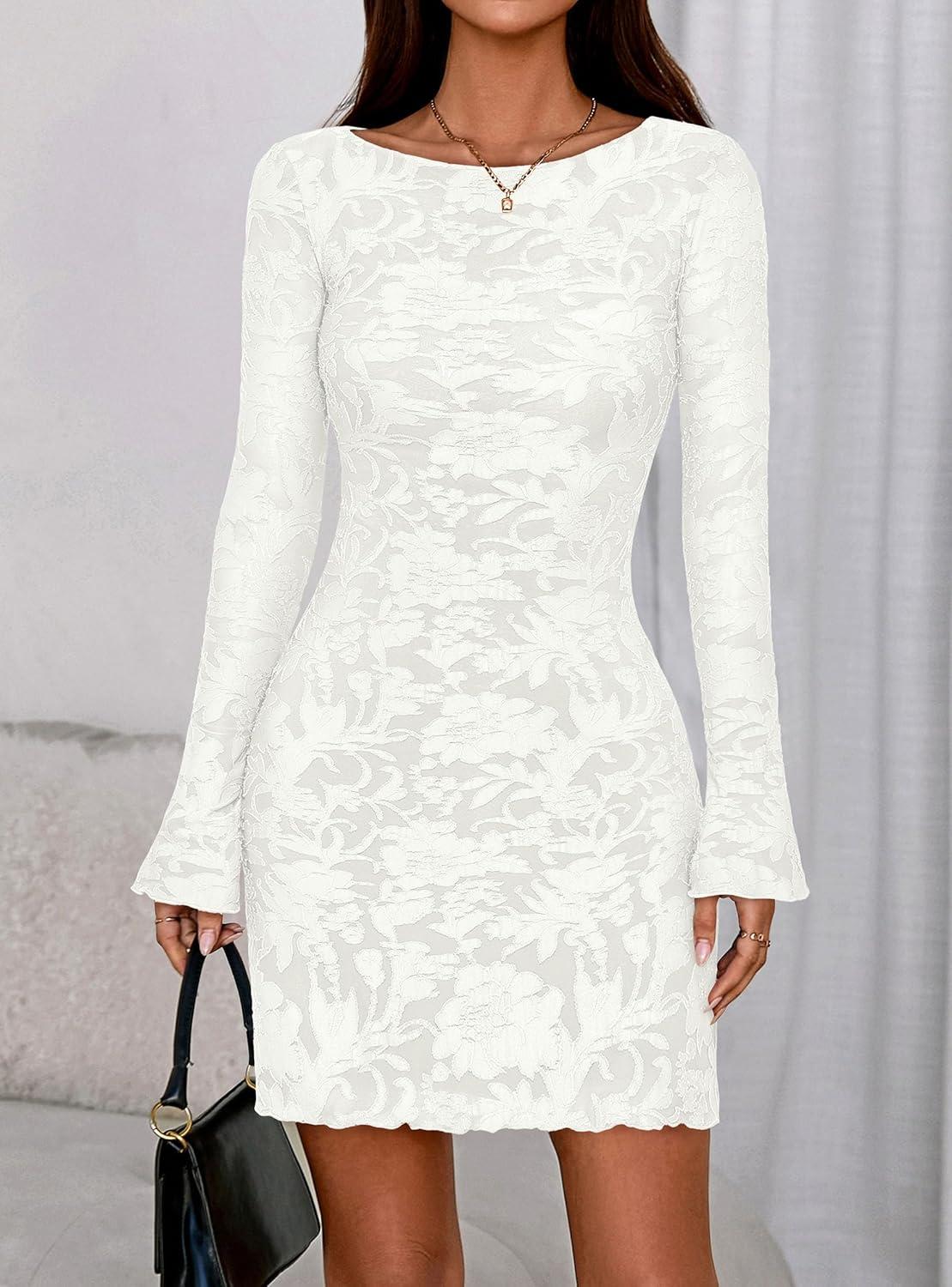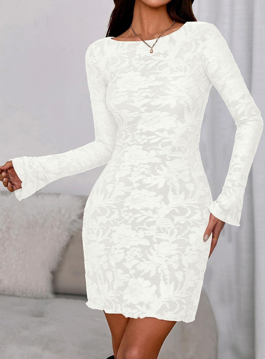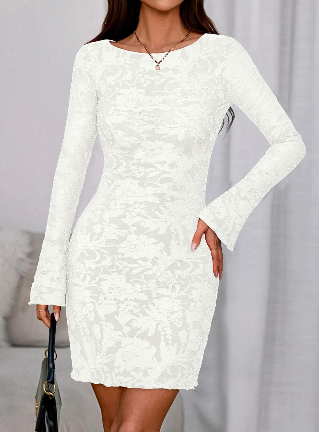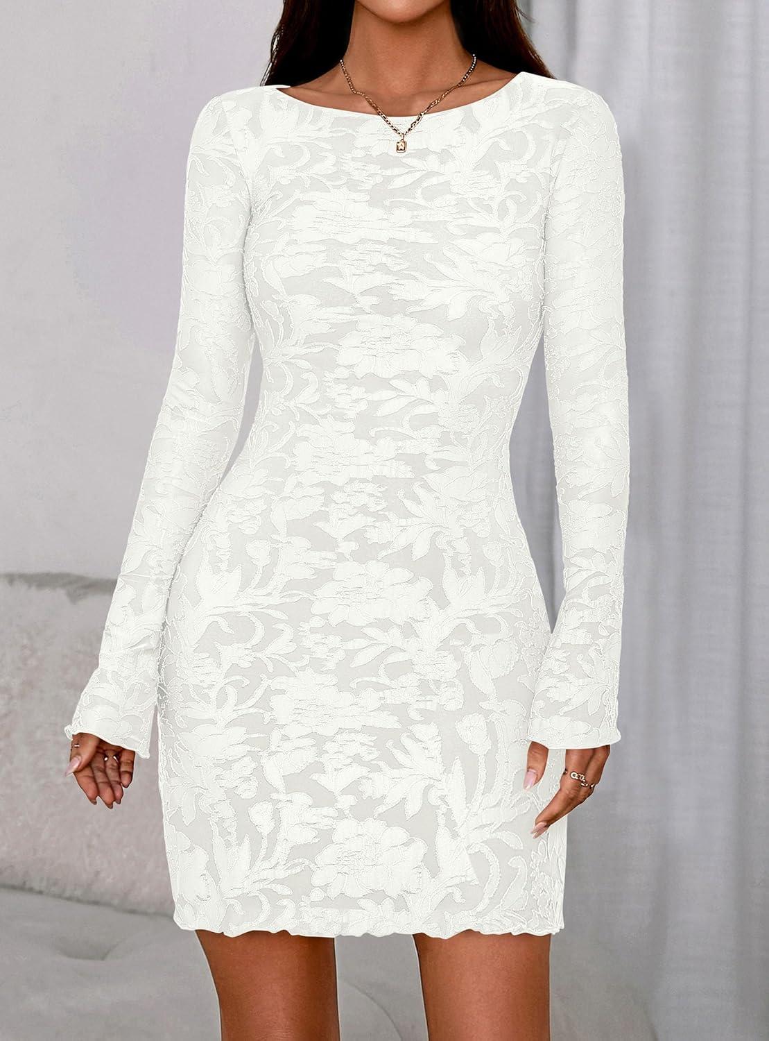 PRETTYGARDEN Women's 2025 Fall Fashion Floral Long Sleeve Mini Dress Mesh Bodycon Short Party Date Night Going Out Dresses(Floral White)