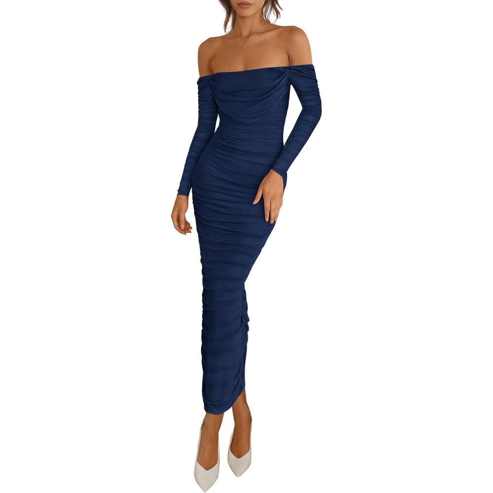 PRETTYGARDEN Womens 2025 Fall Long Sleeve Maxi Dress Off Shoulder Mesh Ruched Bodycon Trendy Long Wedding Guest Dresses(Navy Blue)