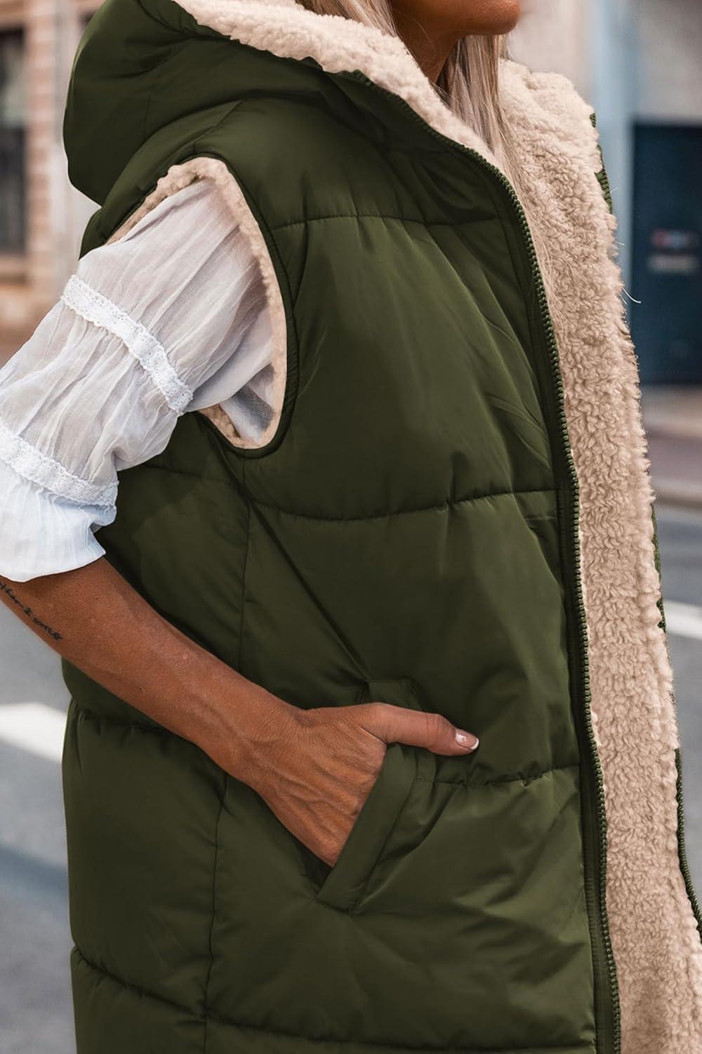 PRETTYGARDEN Womens 2025 Fall Reversible Long Vests Sleeveless Fleece Jacket Zip Up Hoodie Pockets Warm Coat Winter Clothing(Army Green)
