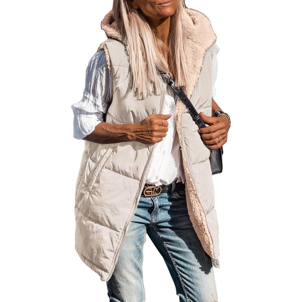 PRETTYGARDEN Womens 2025 Fall Reversible Long Vests Sleeveless Fleece Jacket Zip Up Hoodie Pockets Warm Coat Winter Clothing(Light Khaki)