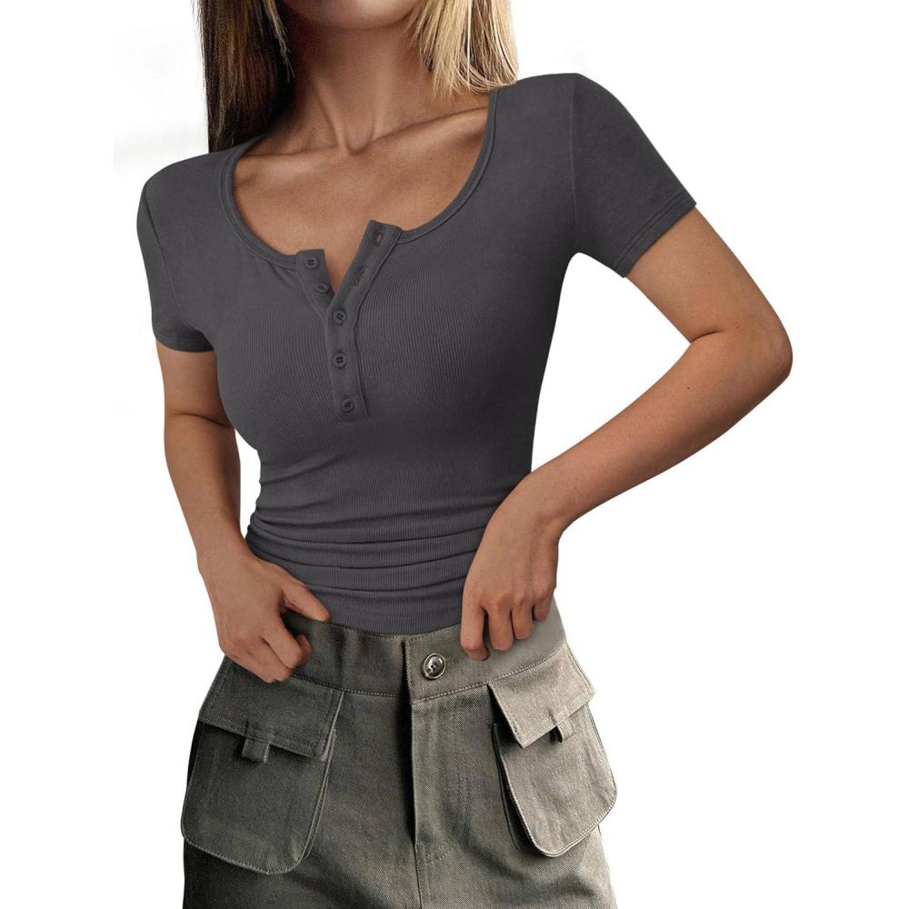 PRETTYGARDEN Women's 2025 Fall Summer Short Sleeve Tops Ribbed Henley Button Slim Fit Basic Casual T Shirts Blouse Clothing(Dark Grey)