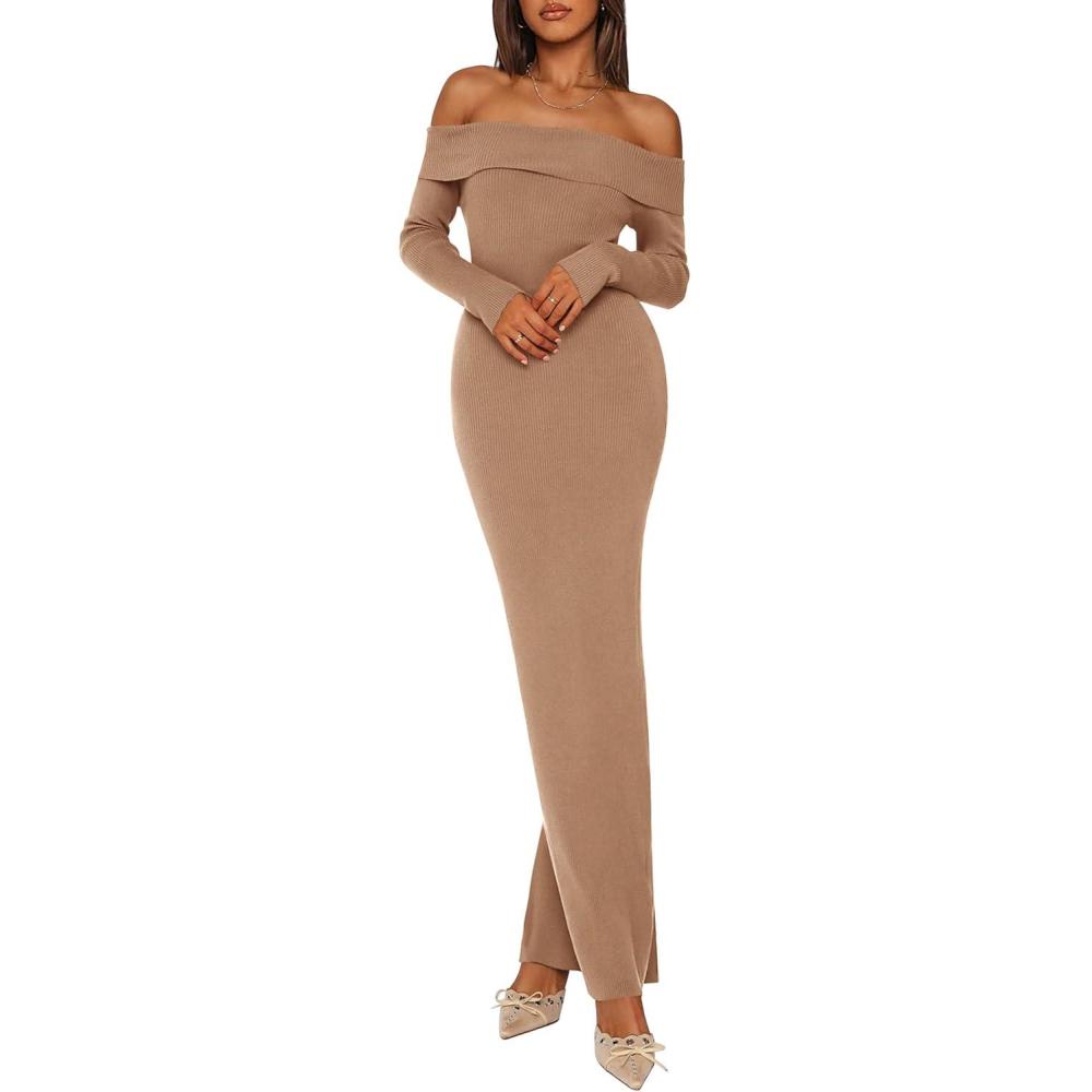 PRETTYGARDEN Women's 2025 Fall Sweater Dress Long Sleeve Off Shoulder Slit Maxi Bodycon Cocktail Party Dresses(Khaki)