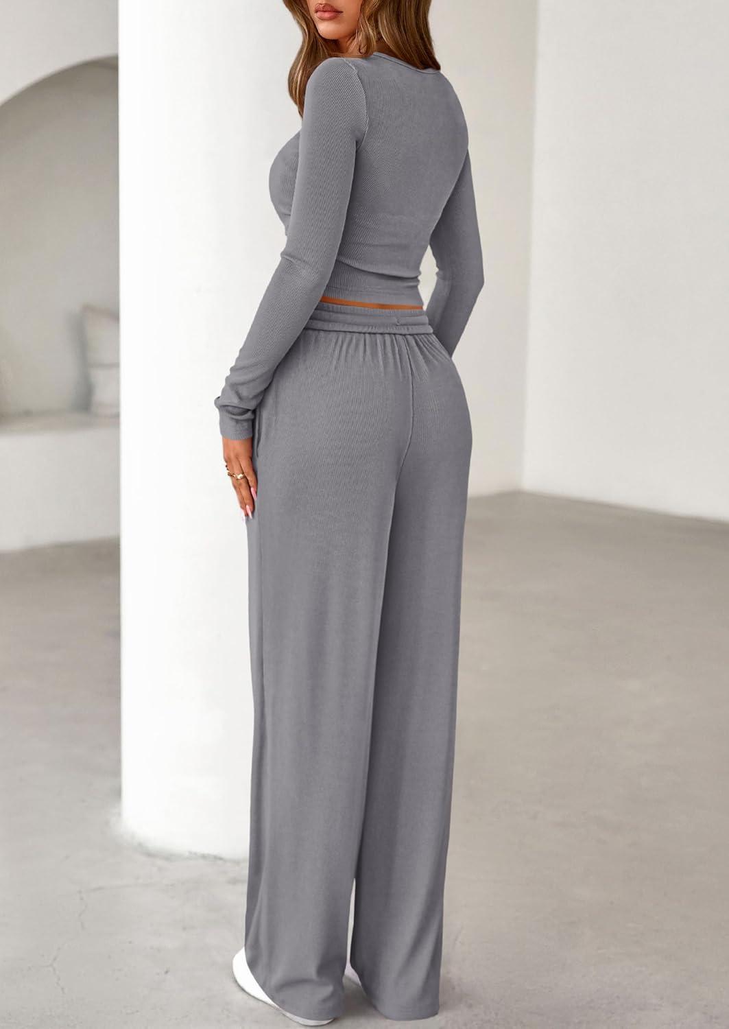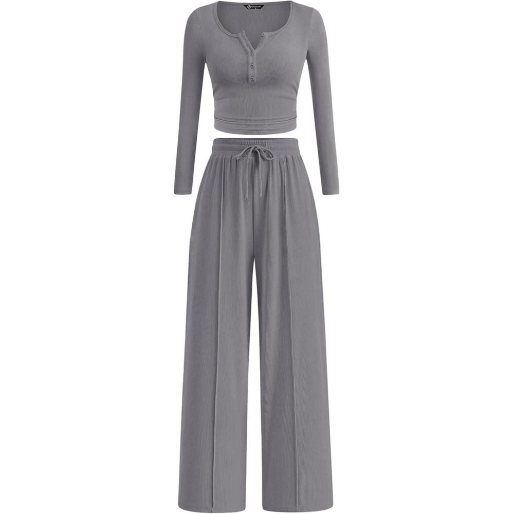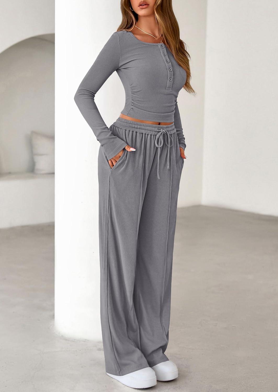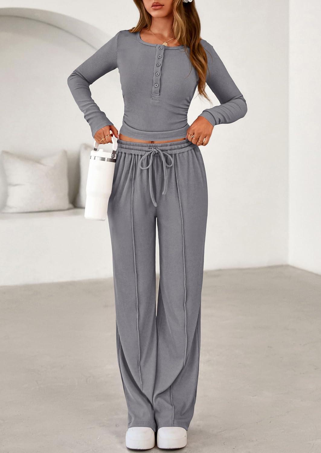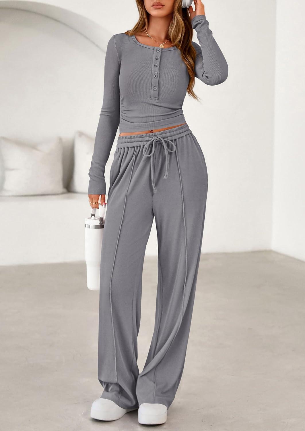PRETTYGARDEN Women's 2025 Fall Trendy 2 Piece Outfits Lounge Sets Long Sleeve Top Henley Shirts Wide Leg Pants Travel Clothes(Grey)