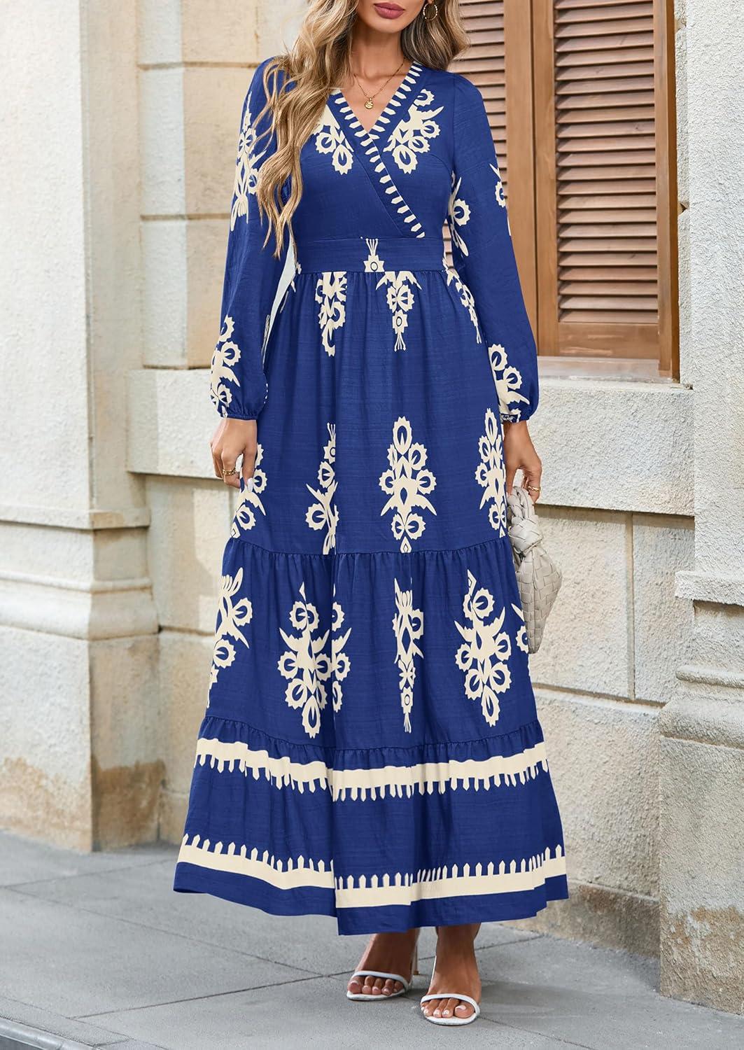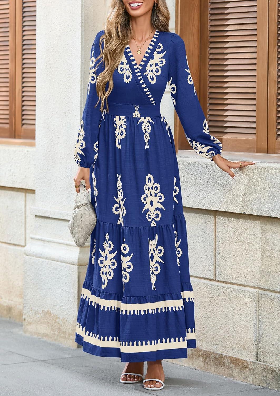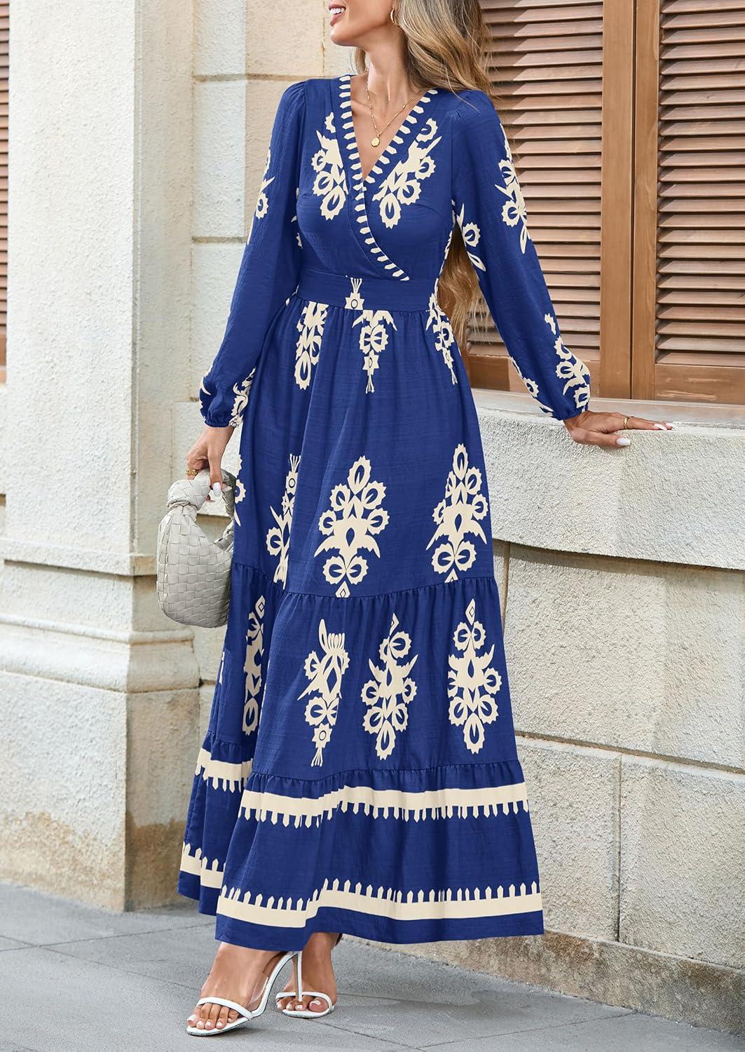 PRETTYGARDEN Women's 2025 Fall Wedding Guest Dresses Boho Floral Long Sleeve V Neck Flowy Elegant Maxi Dress Beach Clothes(Floral Navy Apricot)