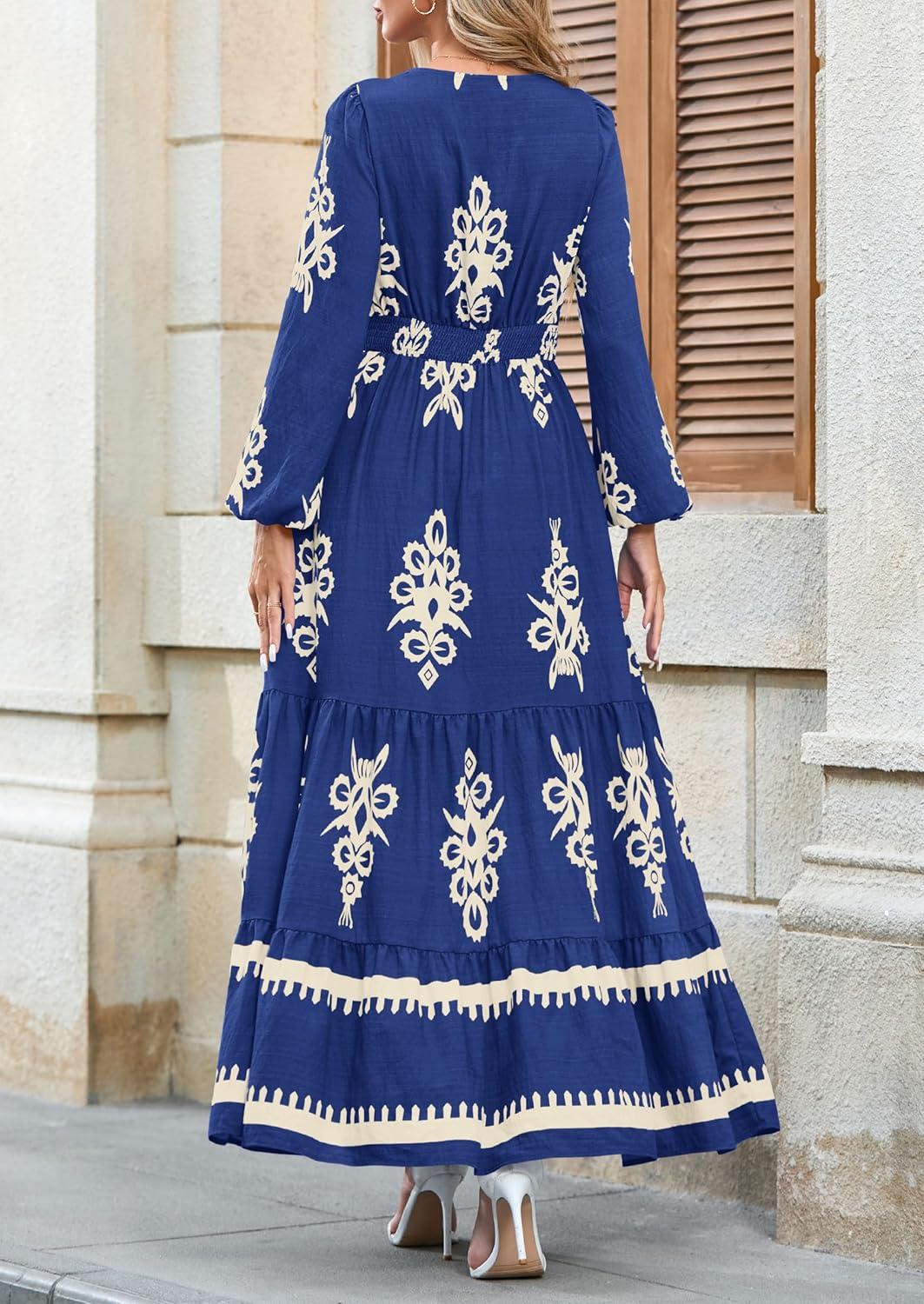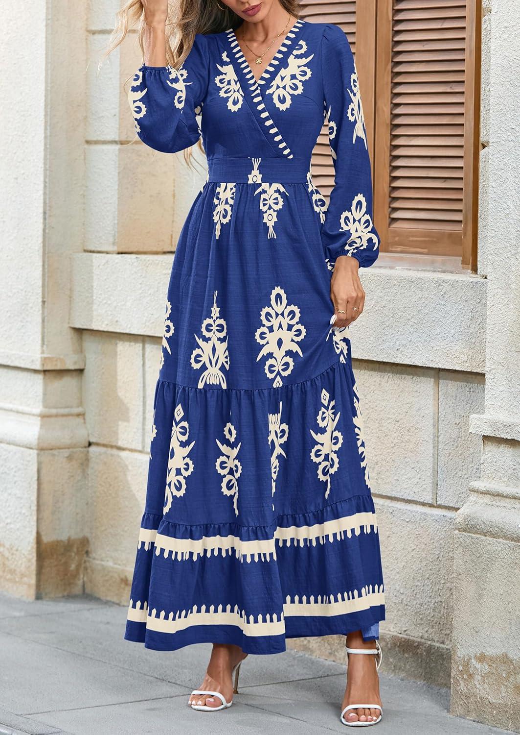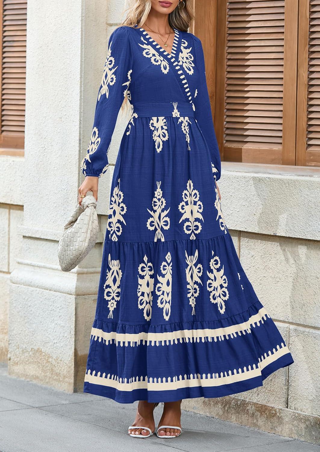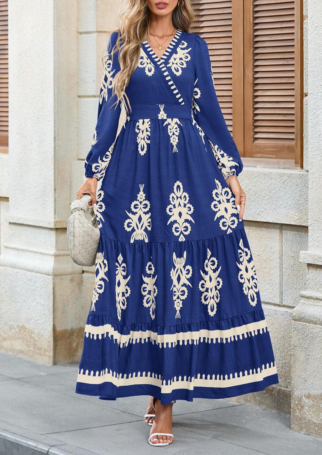 PRETTYGARDEN Women's 2025 Fall Wedding Guest Dresses Boho Floral Long Sleeve V Neck Flowy Elegant Maxi Dress Beach Clothes(Floral Navy Apricot)