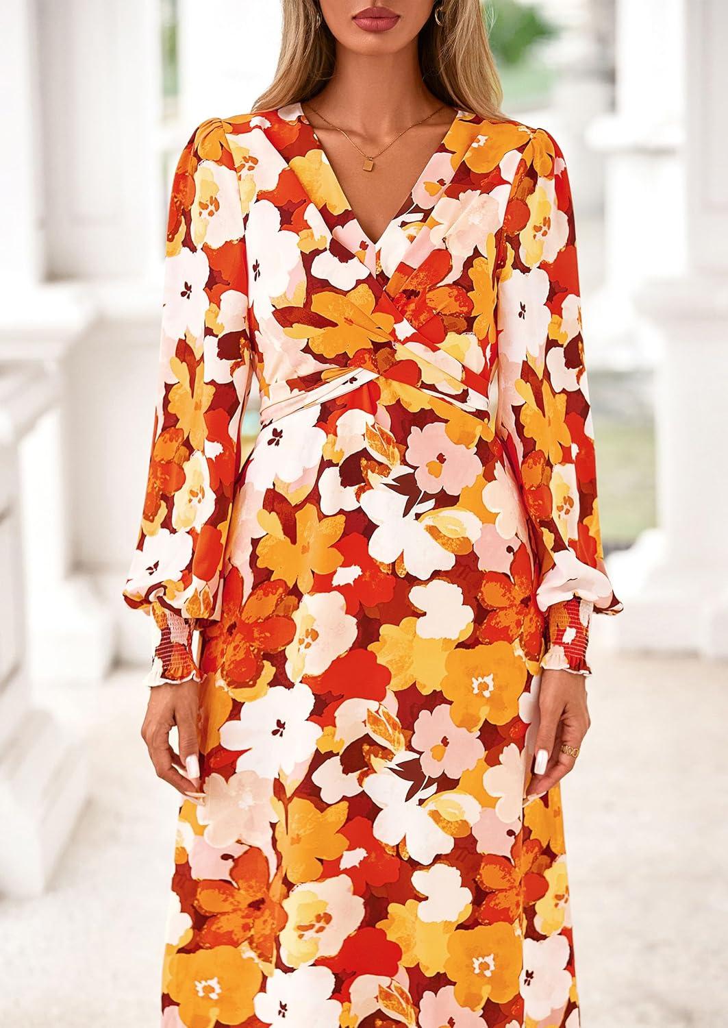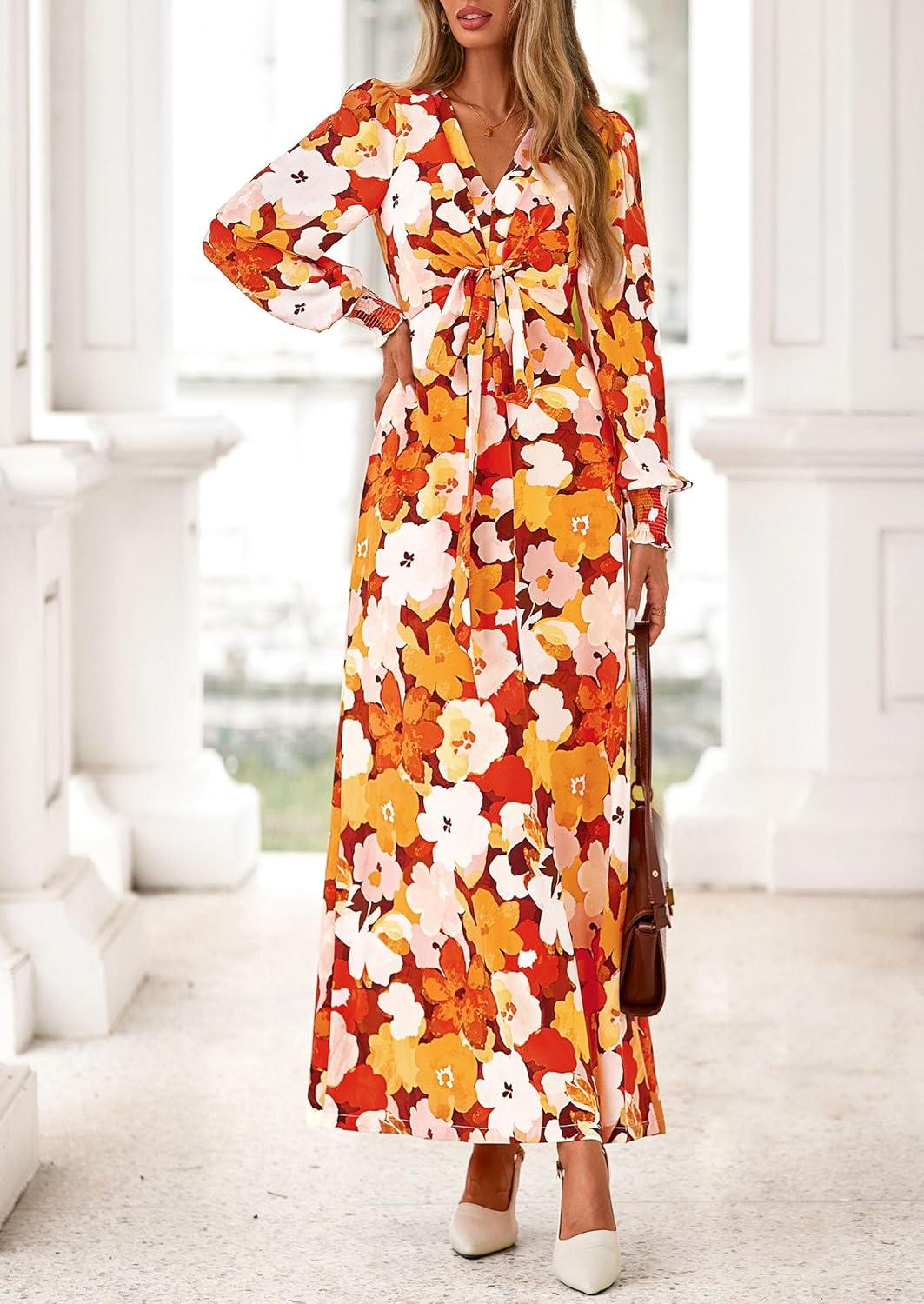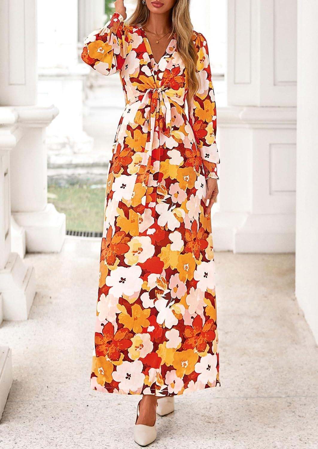 PRETTYGARDEN Women's 2025 Fall Wedding Guest Dresses Floral Long Sleeve V Neck Belted Long Flowy Boho Maxi Dress(Floral Orange)