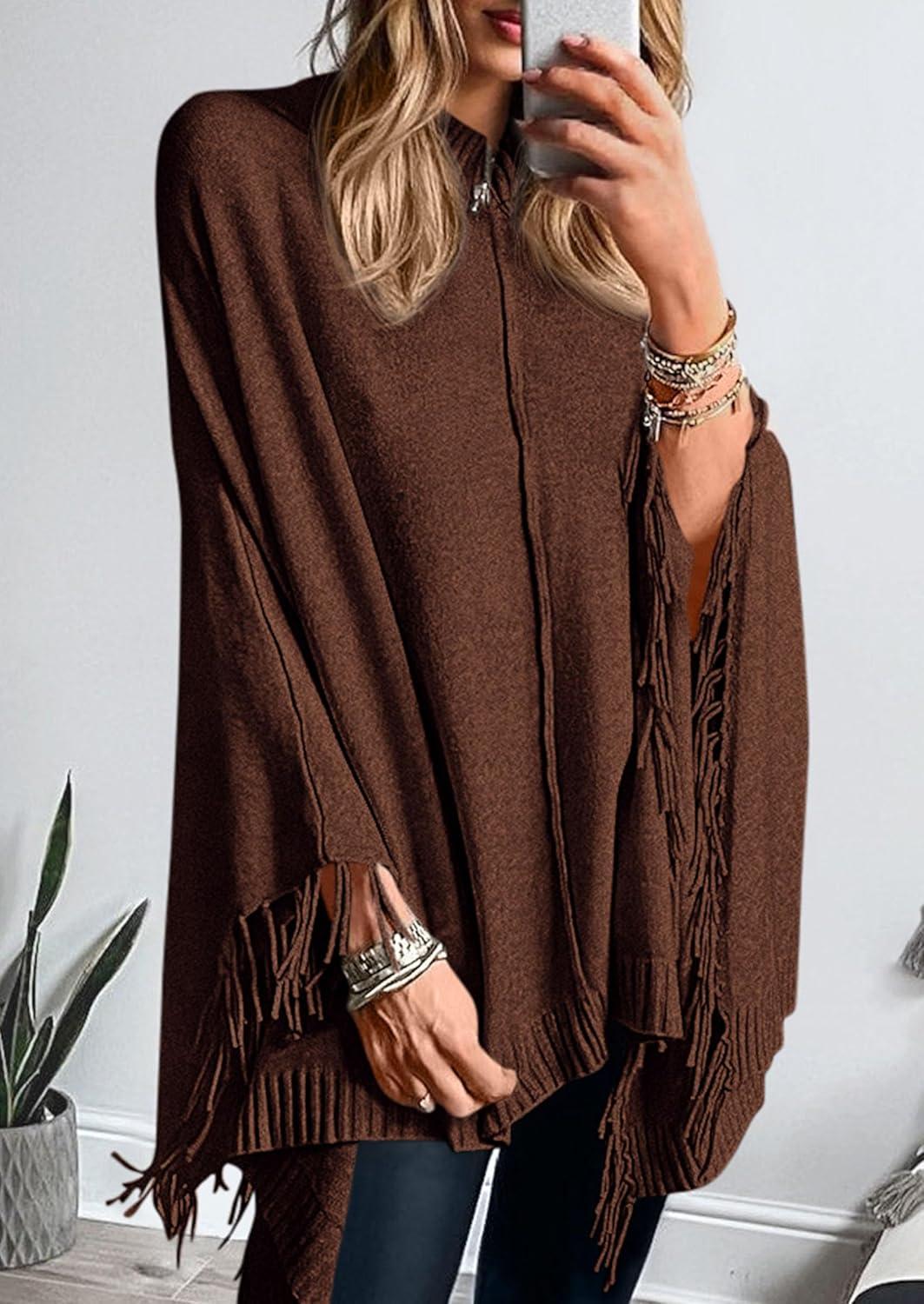 PRETTYGARDEN Women's 2025 Fall Winter Poncho Sweaters Trendy Chunky Knit Fringe Shawls Wraps Pullover Tops Holiday Outfits(Brown)