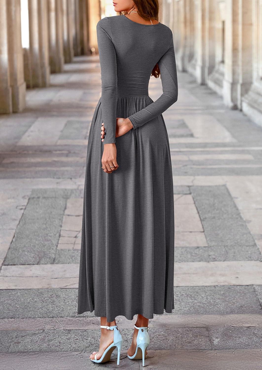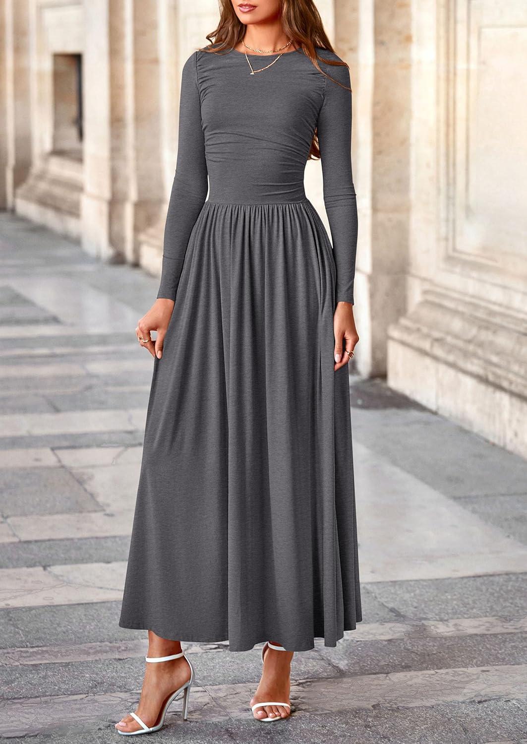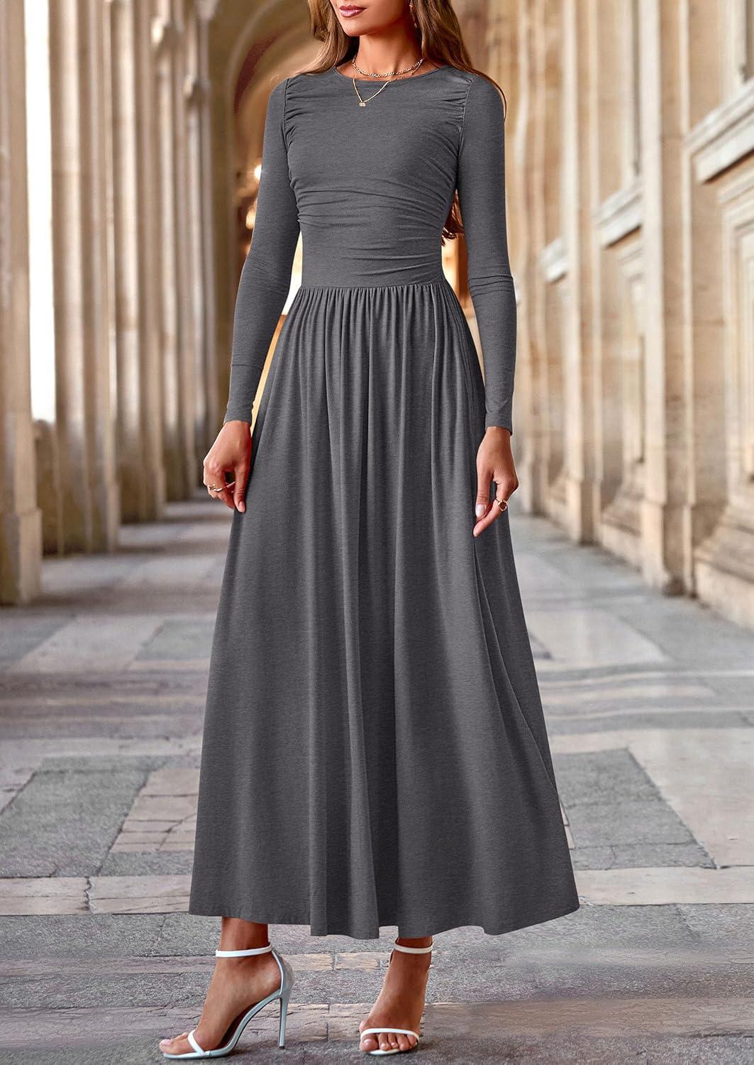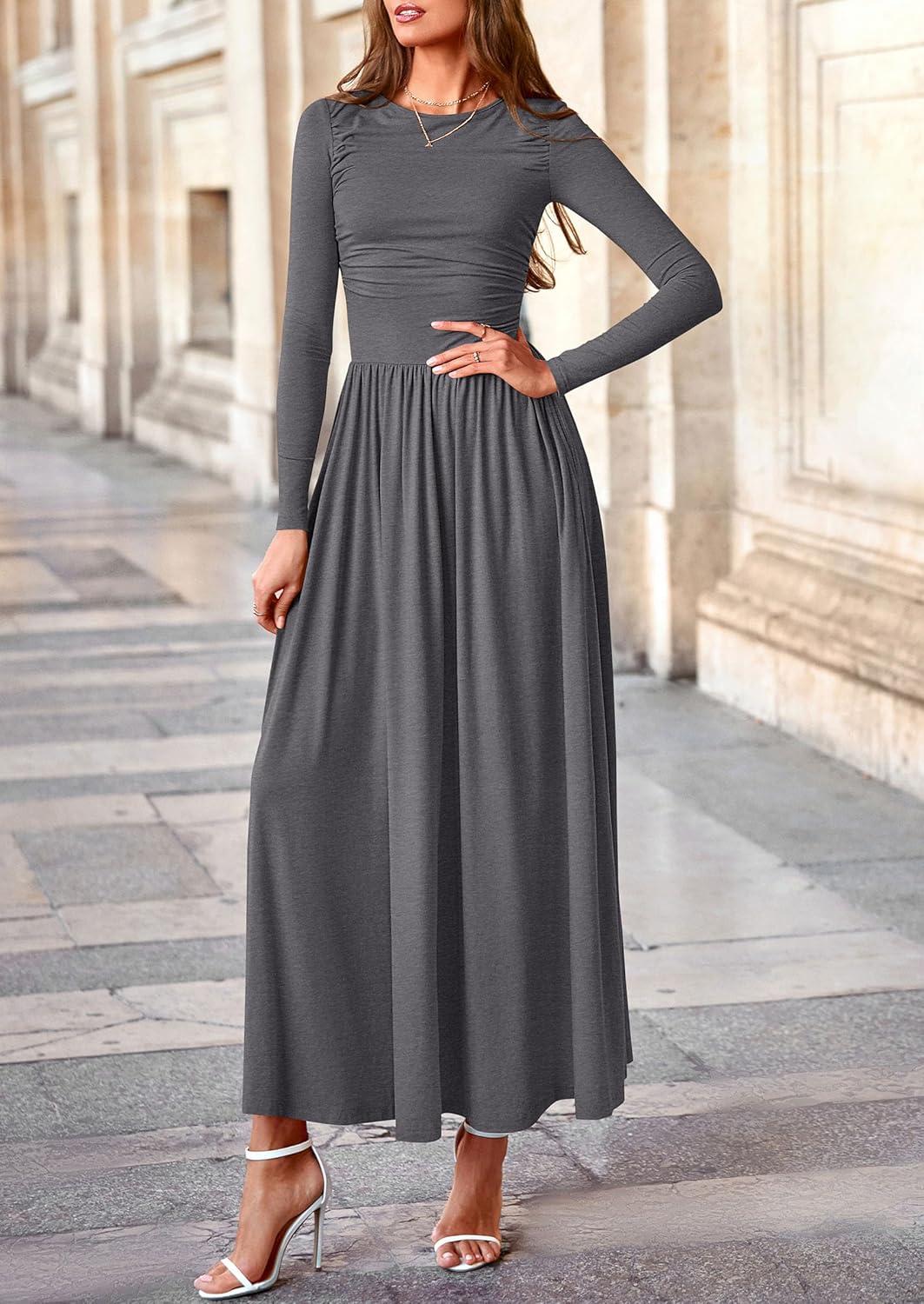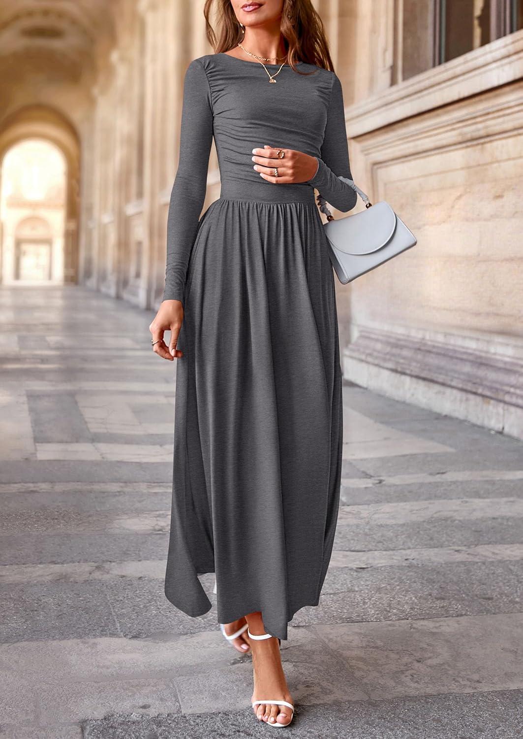 PRETTYGARDEN Women's 2025 Fashion Trendy Fall Long Sleeve Dresses Ruched Flowy Elegant Modest Boho Casual Beach Maxi Dress(Grey)