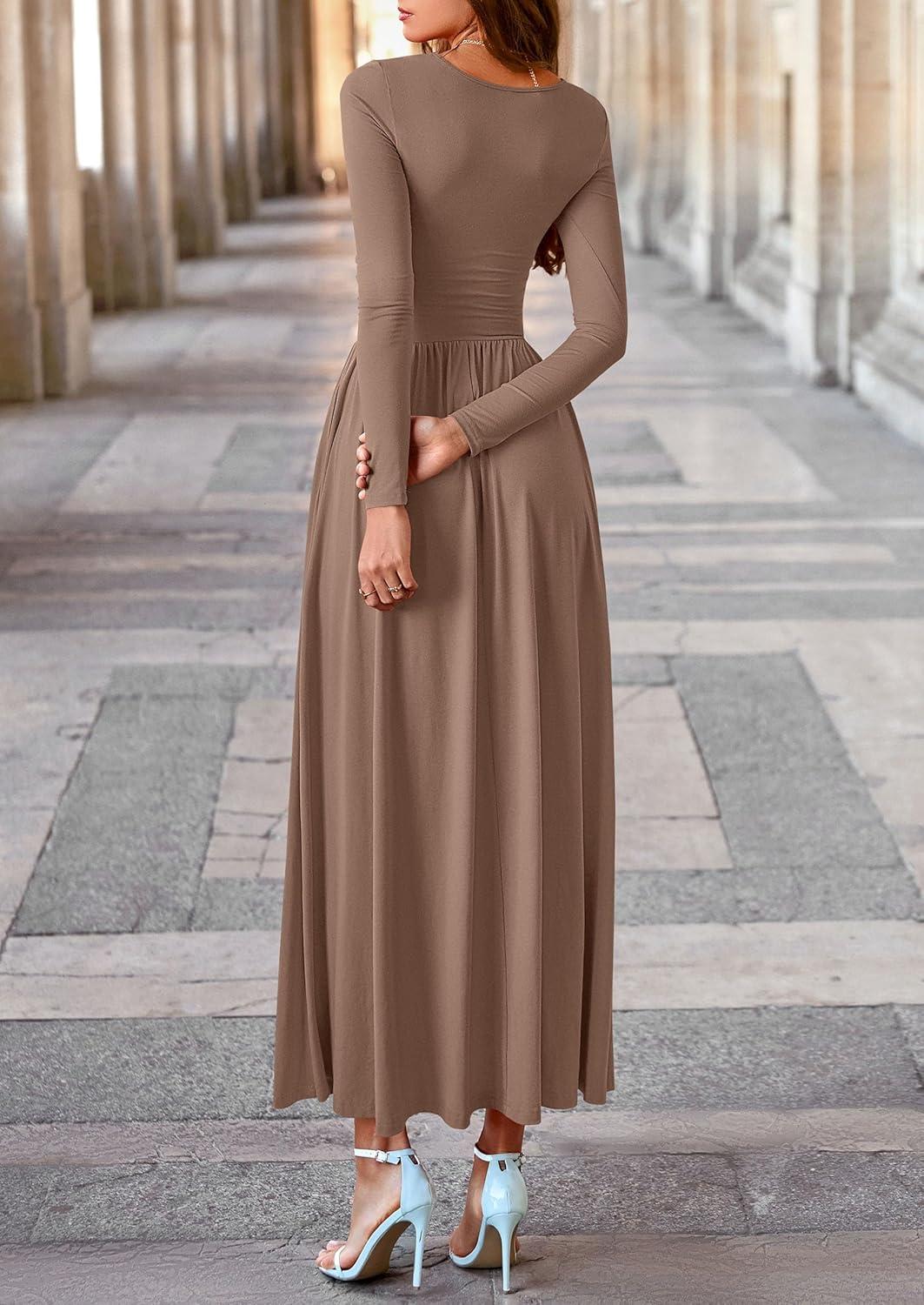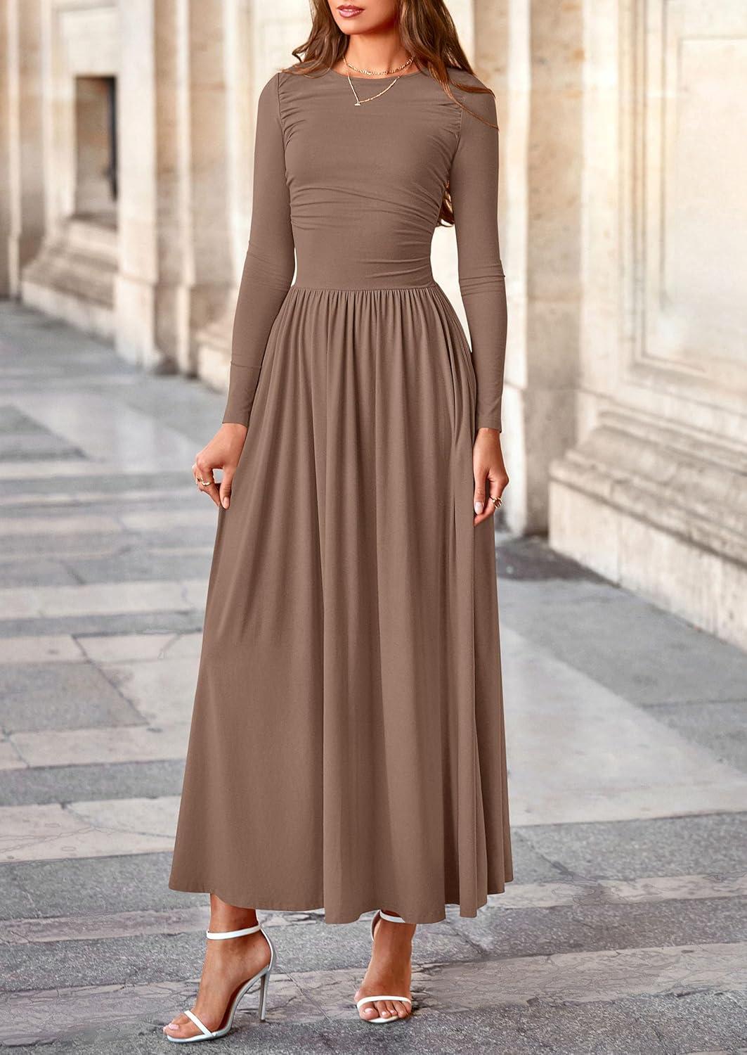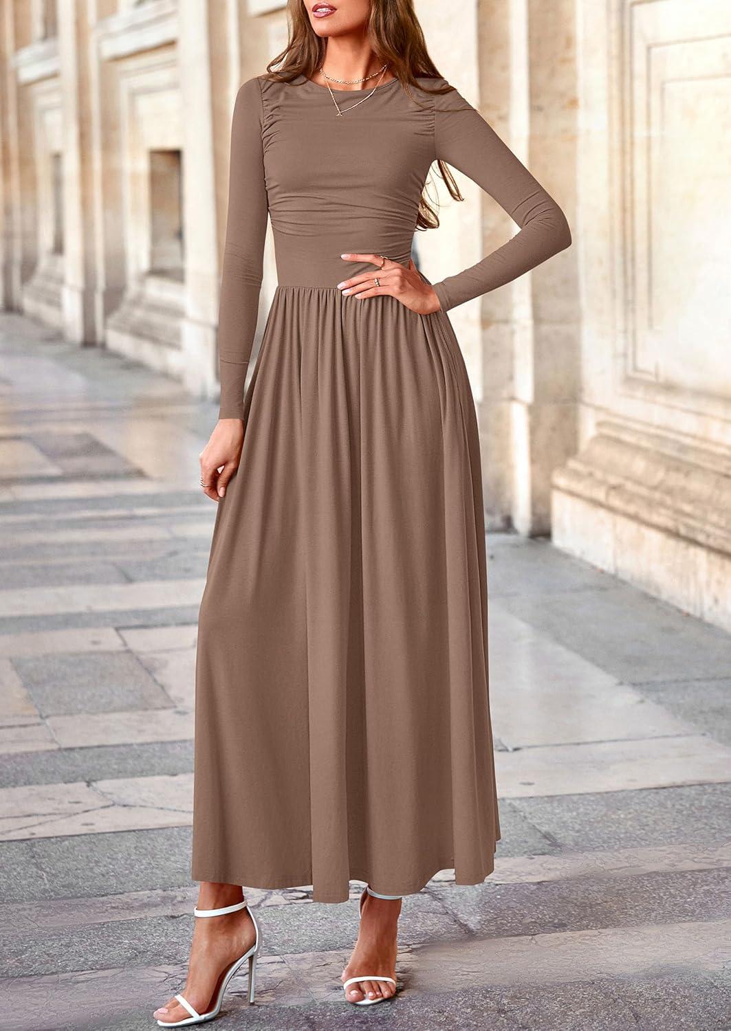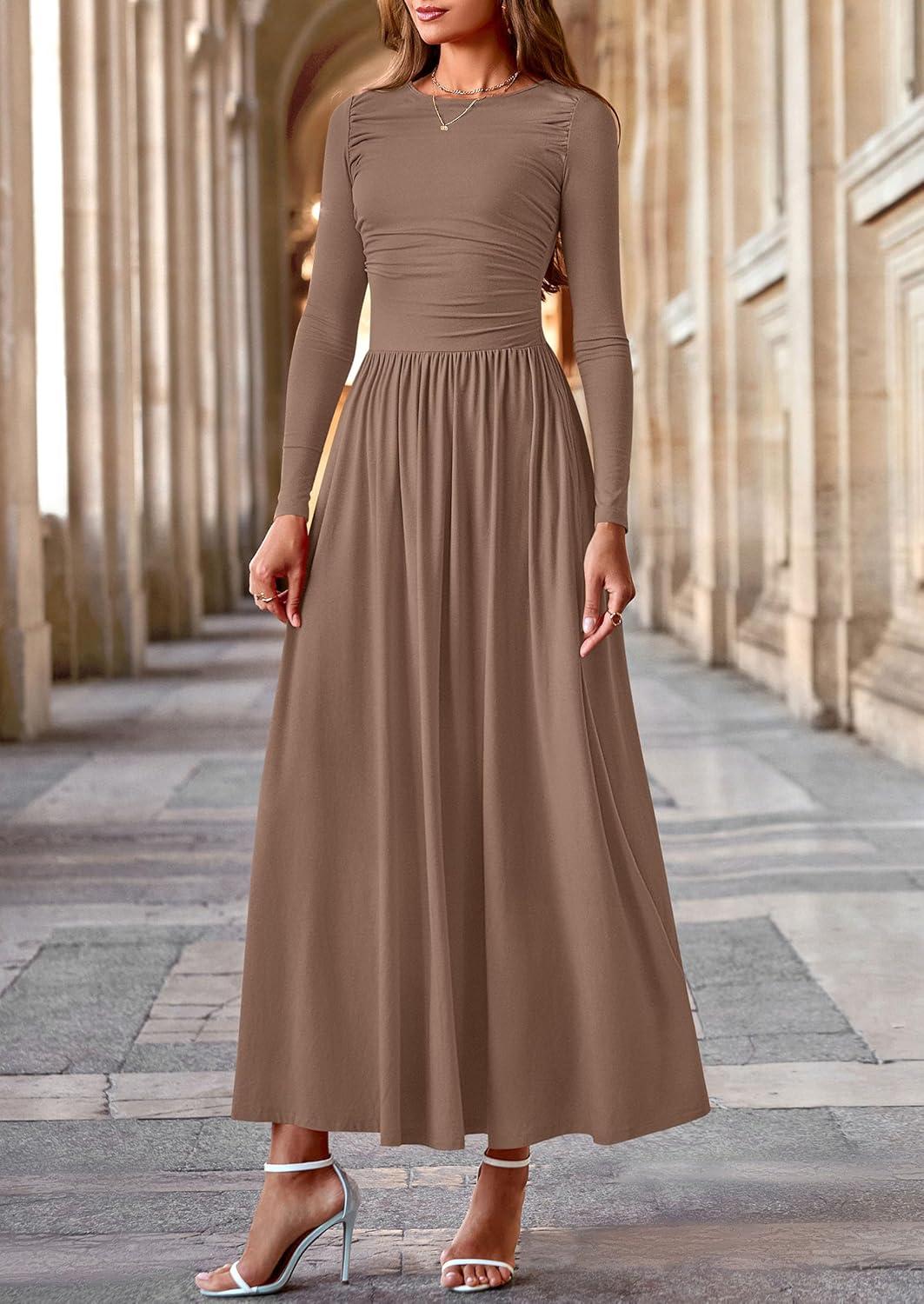 PRETTYGARDEN Women's 2025 Fashion Trendy Fall Long Sleeve Dresses Ruched Flowy Elegant Modest Boho Casual Beach Maxi Dress(Khaki)