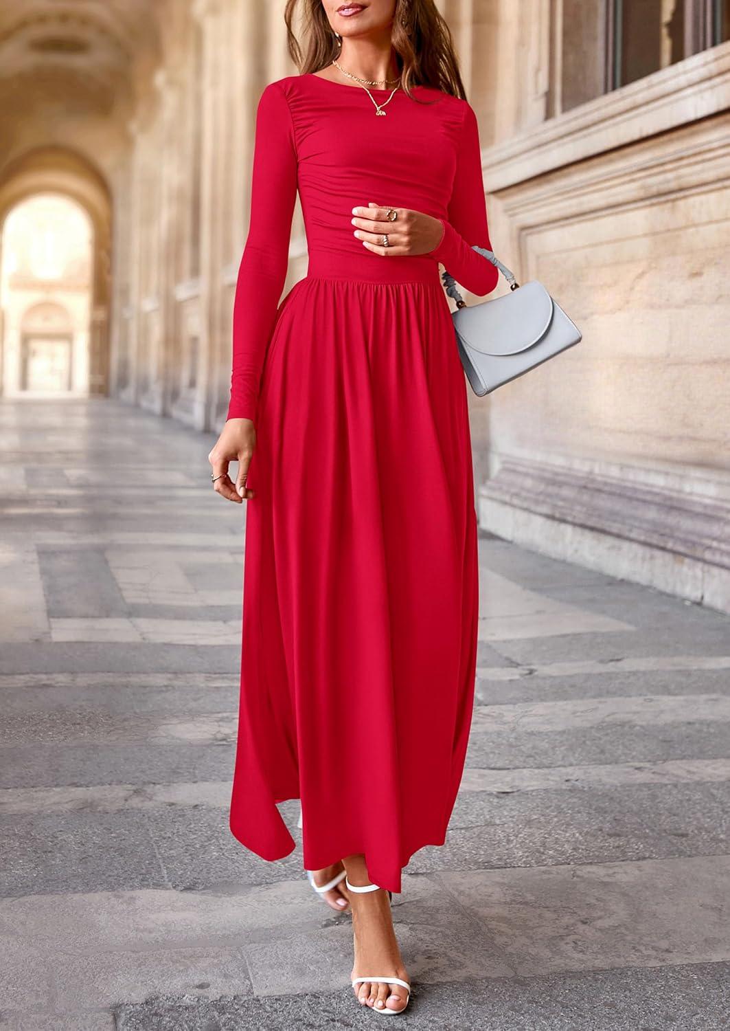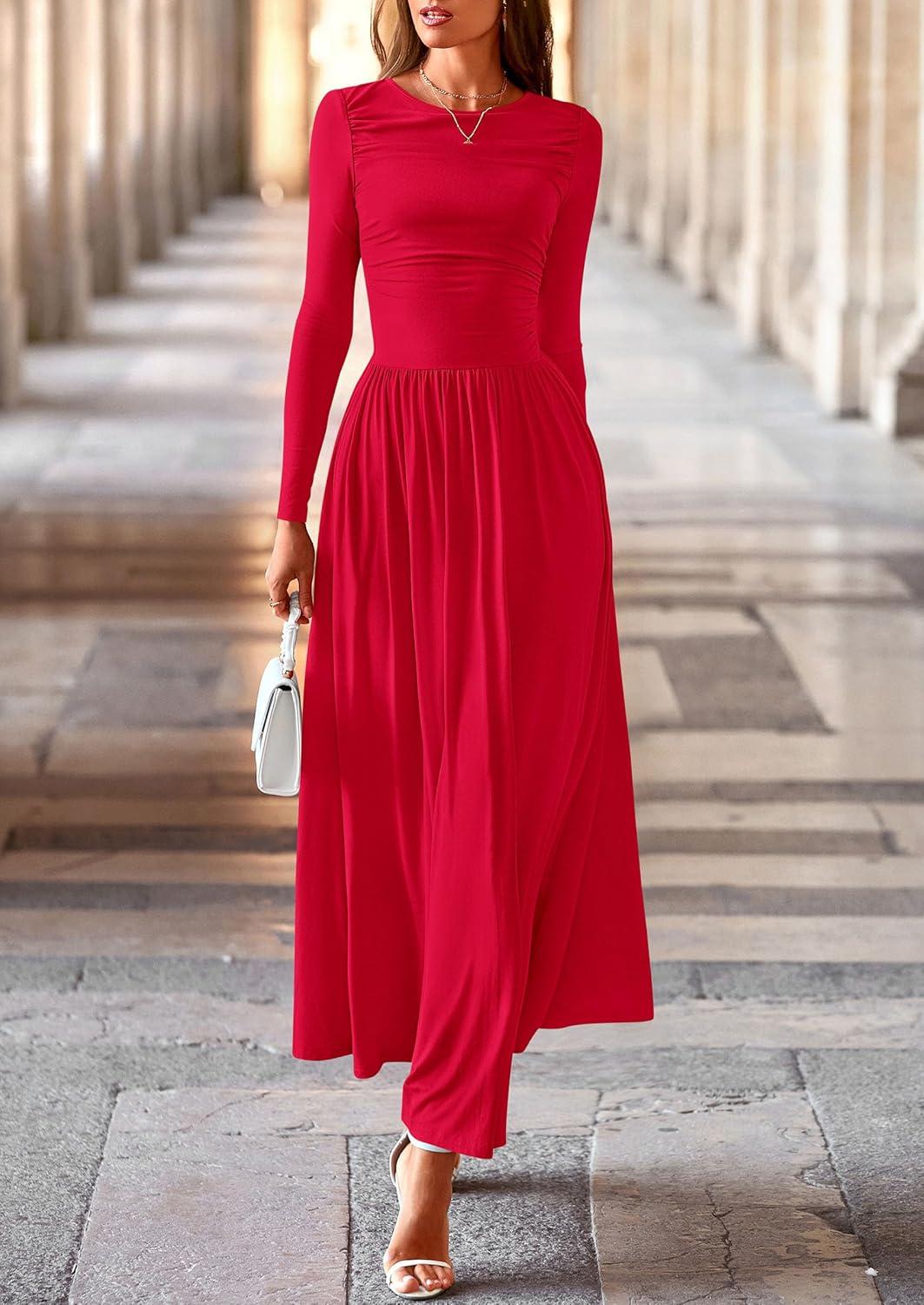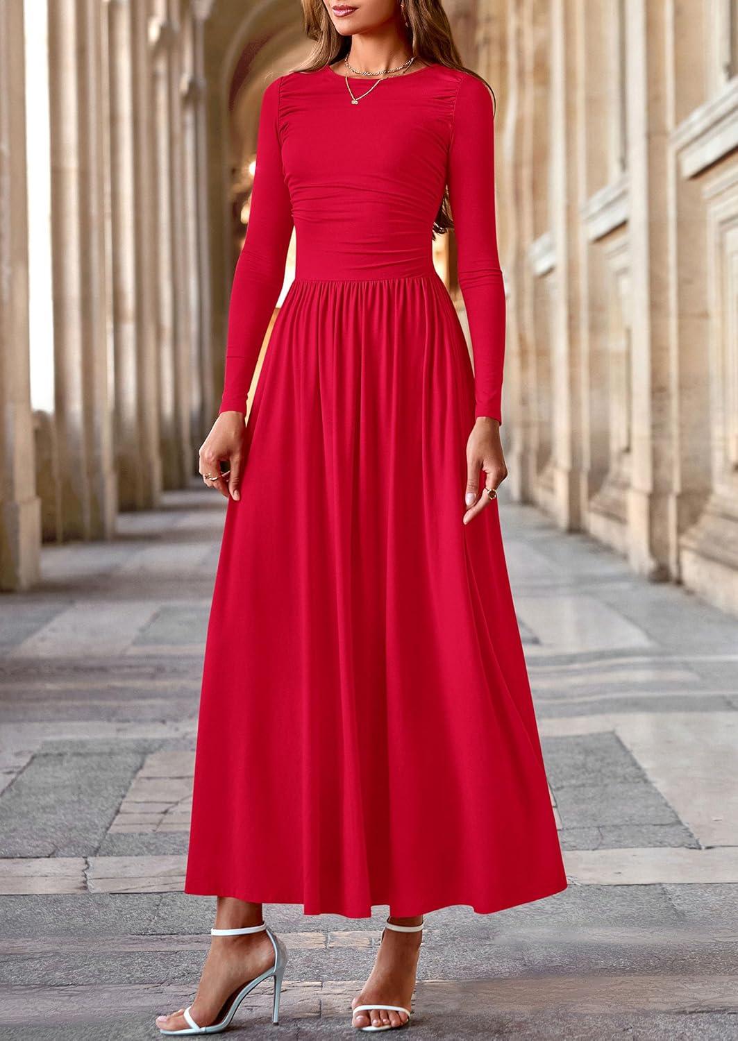 PRETTYGARDEN Women's 2025 Fashion Trendy Fall Long Sleeve Dresses Ruched Flowy Elegant Modest Boho Casual Beach Maxi Dress(Red)