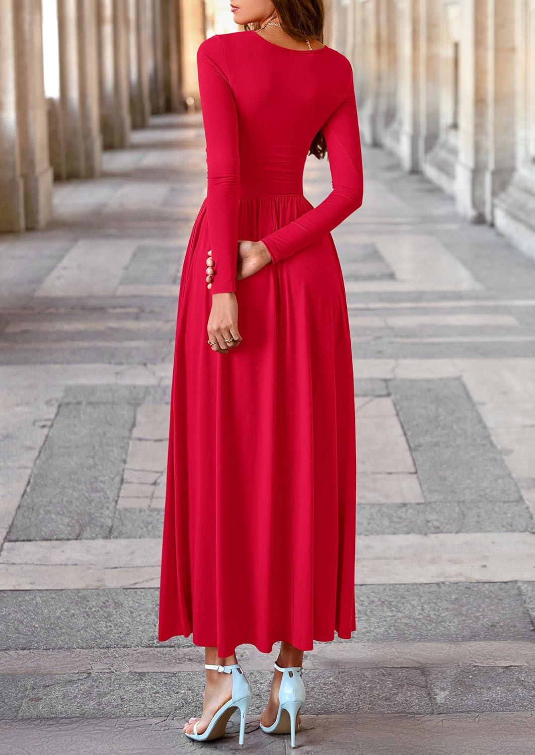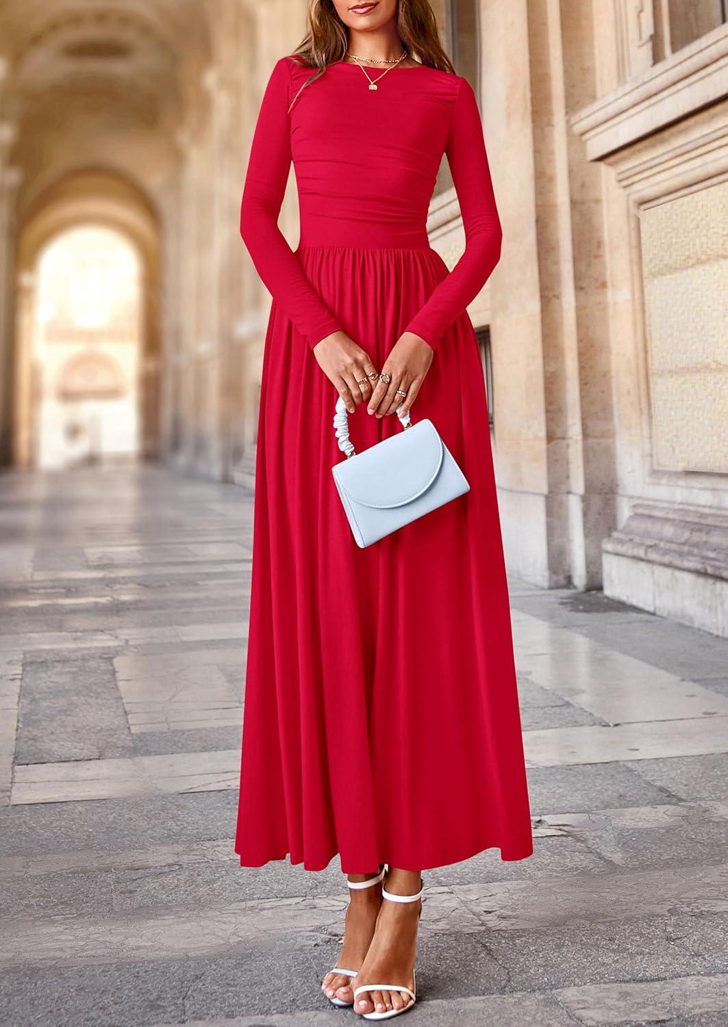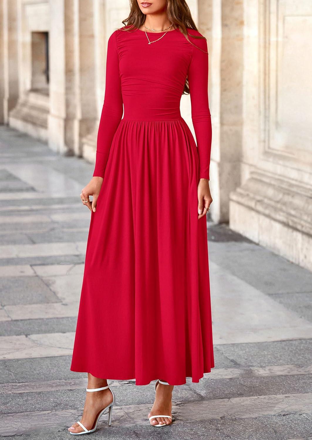 PRETTYGARDEN Women's 2025 Fashion Trendy Fall Long Sleeve Dresses Ruched Flowy Elegant Modest Boho Casual Beach Maxi Dress(Red)