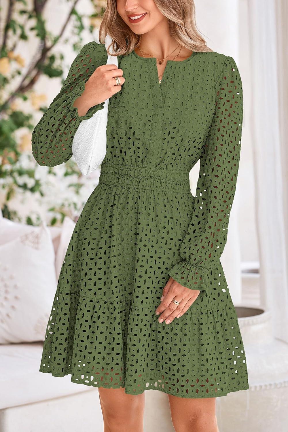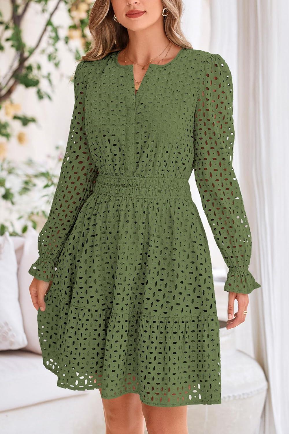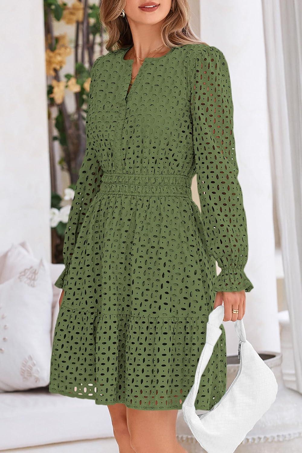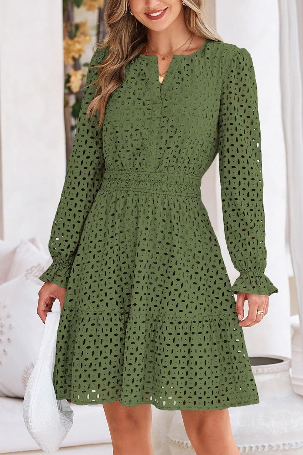 PRETTYGARDEN Women’s 2025 Long Sleeve Mini Dress Eyelet V Neck A Line Casual Elegant Holiday Wedding Guest Party Dresses(Army Green)