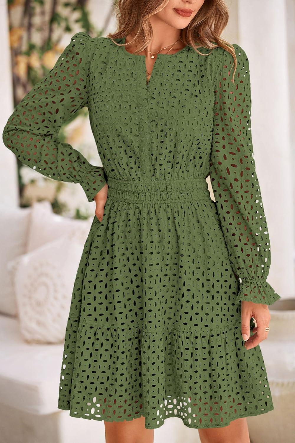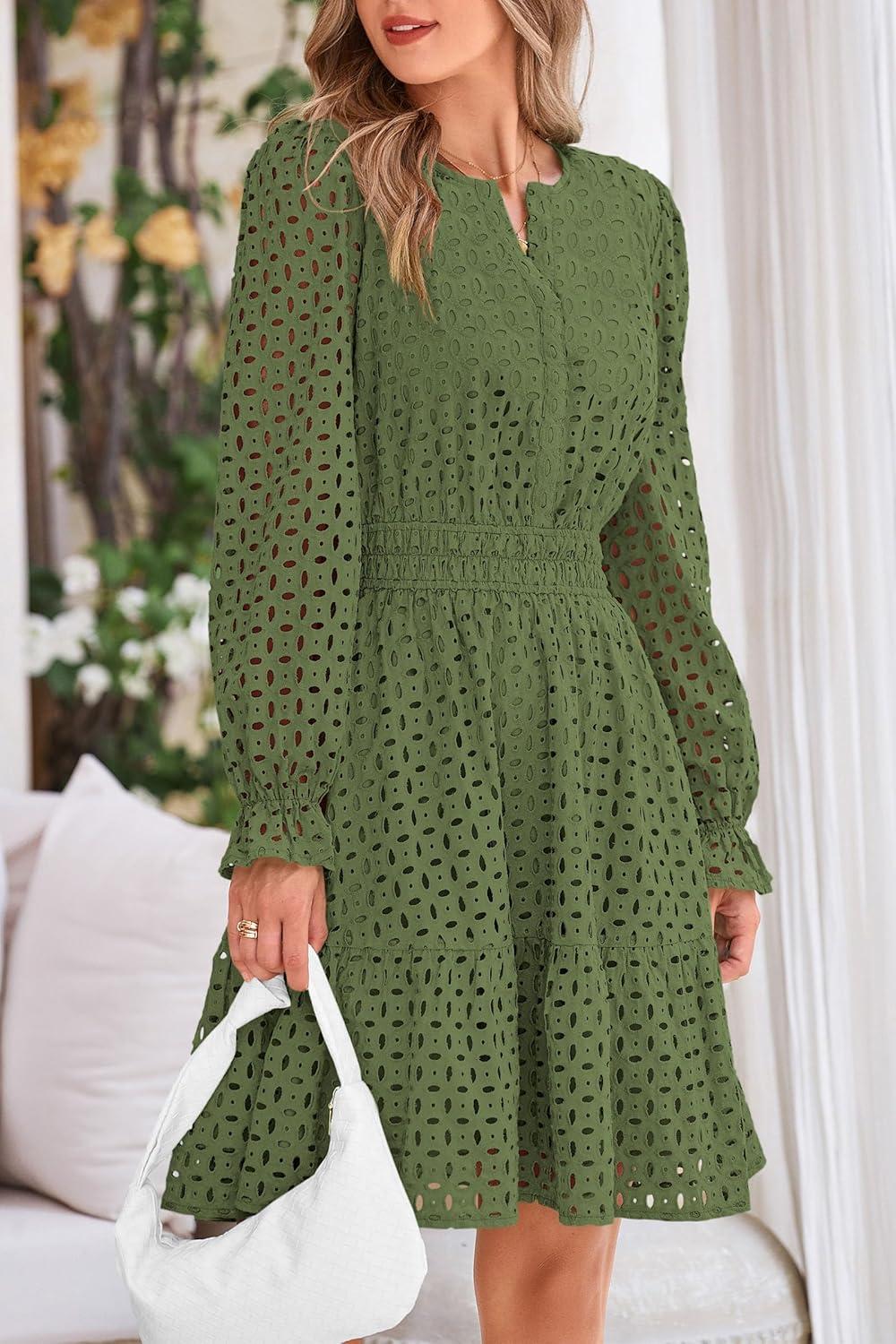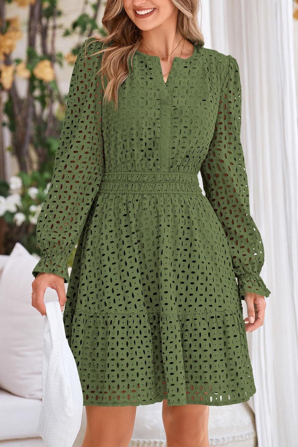 PRETTYGARDEN Women's 2025 Long Sleeve Mini Dress Eyelet V Neck A Line Casual Elegant Holiday Wedding Guest Party Dresses(Army Green)