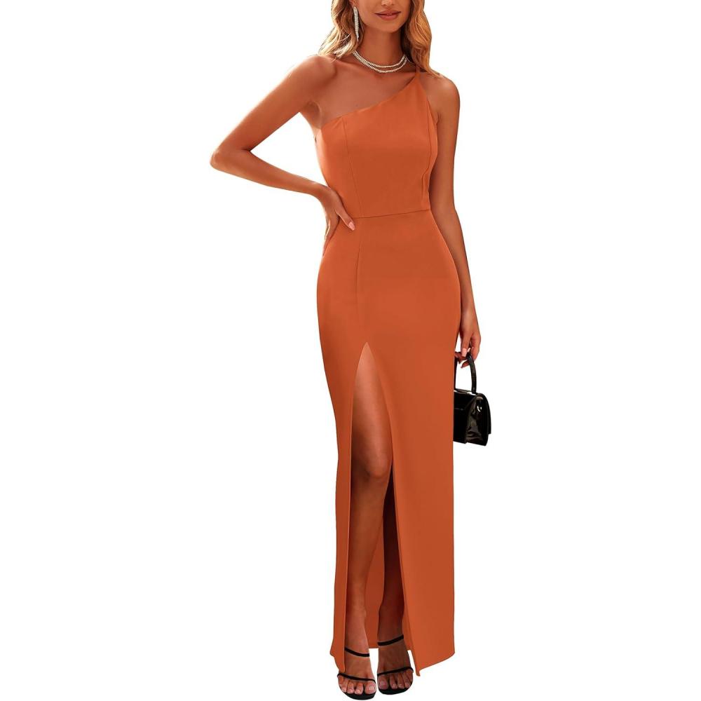 PRETTYGARDEN Women’s 2025 Summer Formal Wedding Guest Dresses One Shoulder Spaghetti Strap High Slit Maxi Bodycon Dress(Brown)