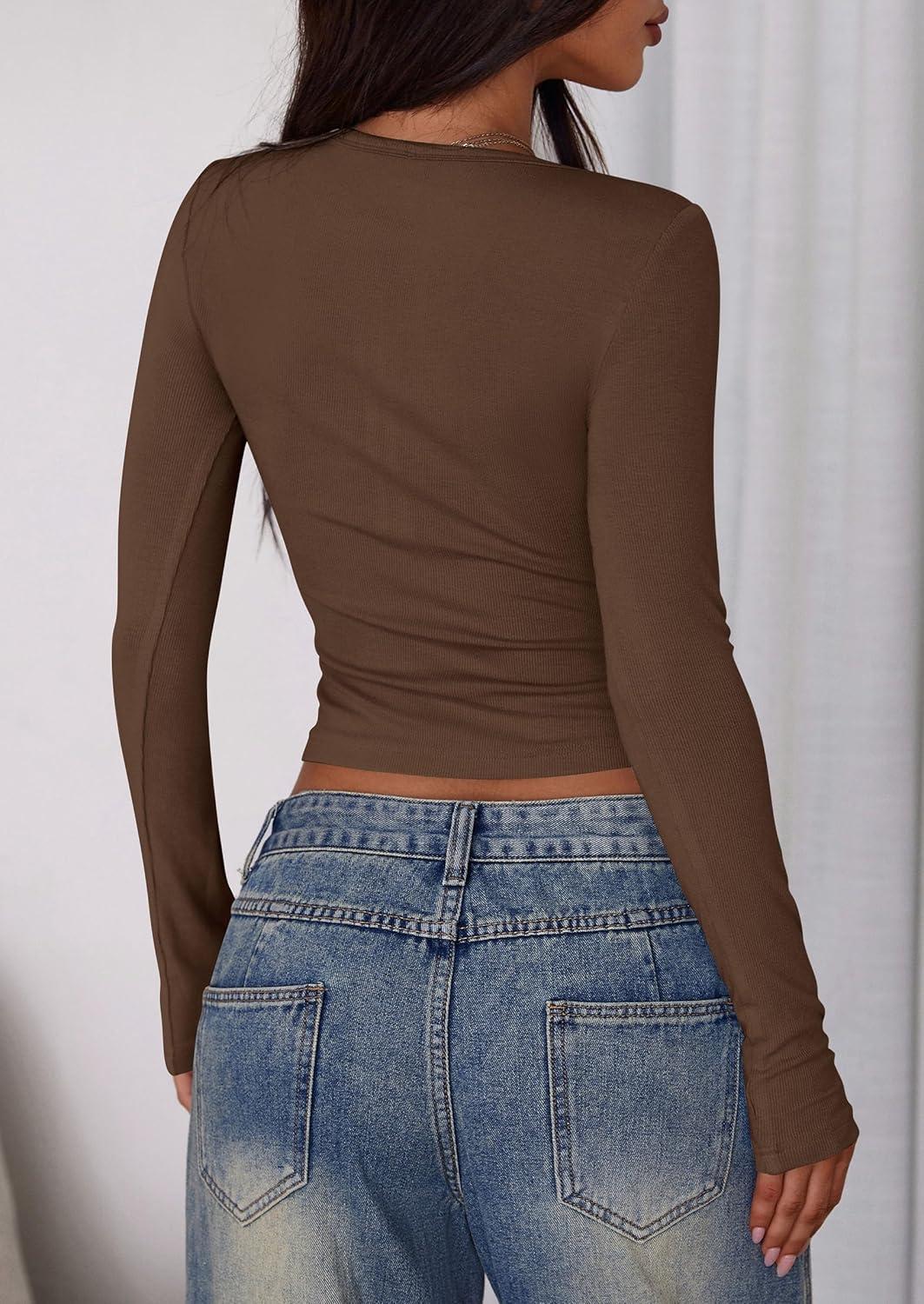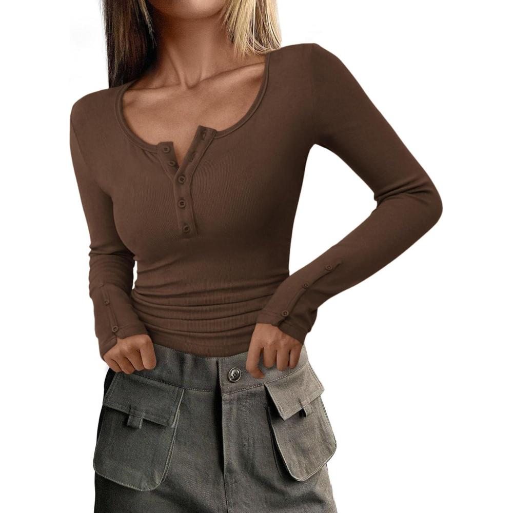 imagePRETTYGARDEN Womens 2025 Summer Long Sleeve Henley T Shirts Ribbed Knit Button Slim Fitted Basic Casual Going Out Fall TopsCoffee