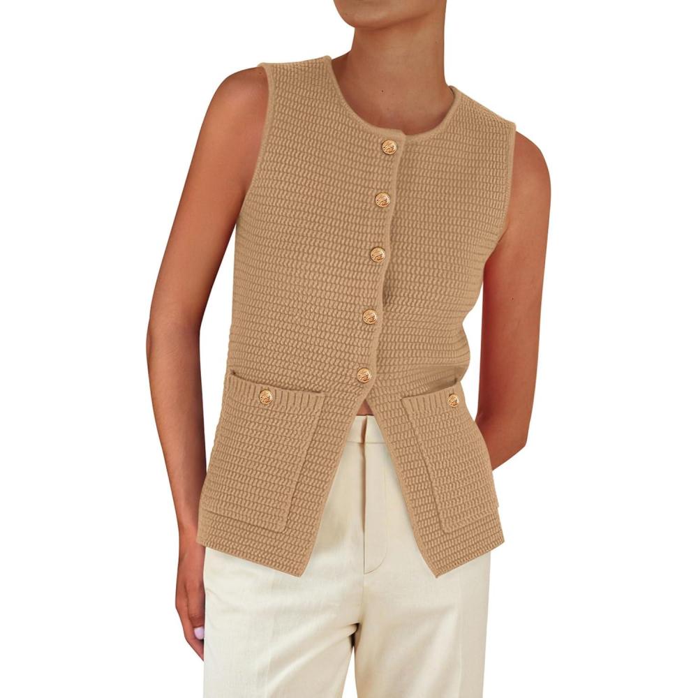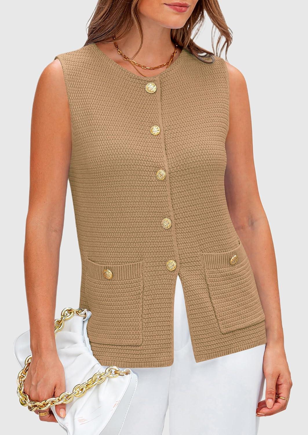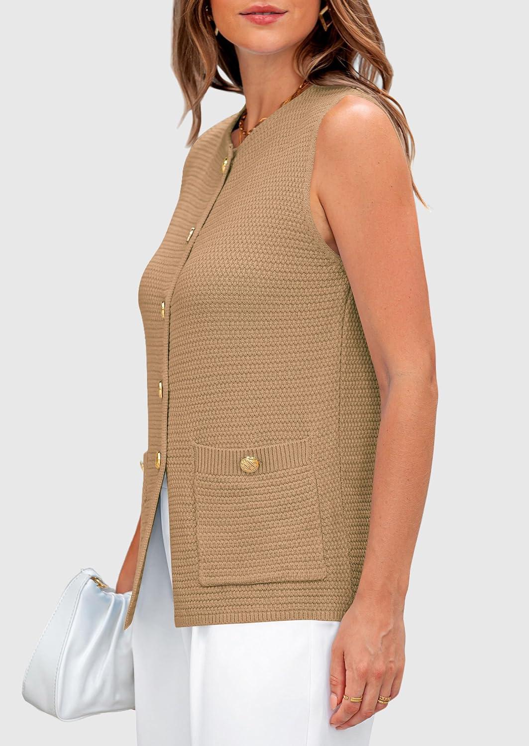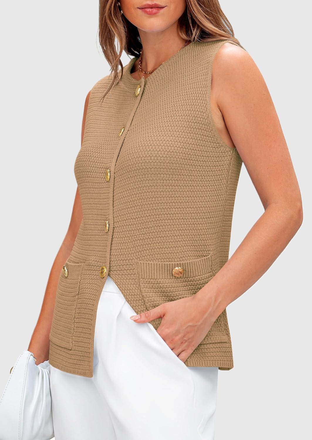 imagePRETTYGARDEN Womens 2025 Summer Sweater Vest Sleeveless Knit Cardigan Button Down Tank Tops Trendy Business Casual OutfitsKhaki