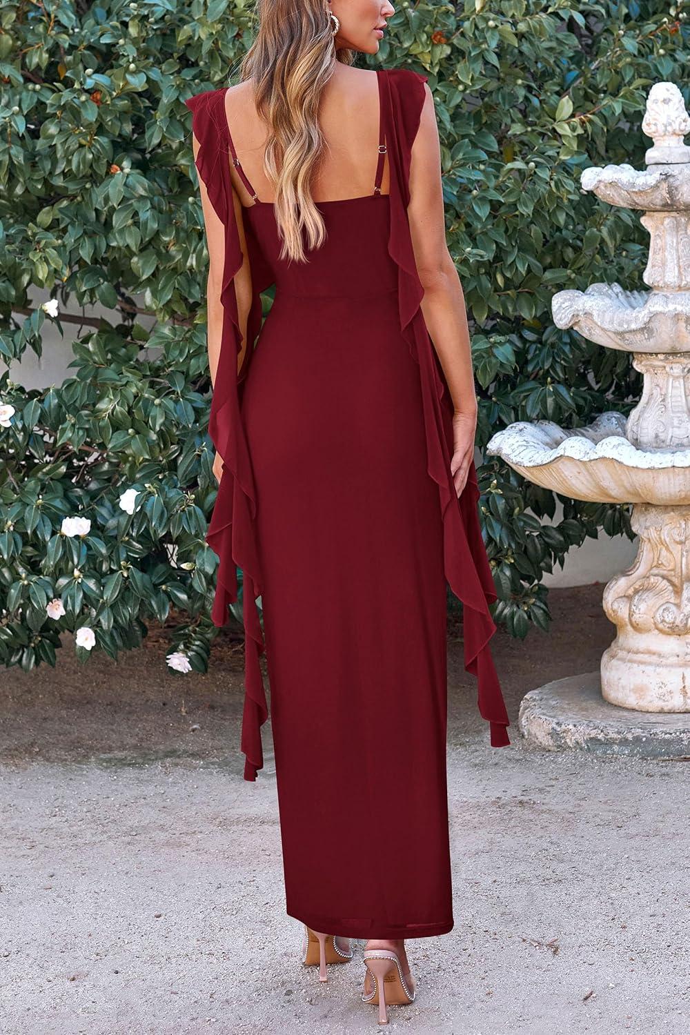 PRETTYGARDEN Women's 2025 Summer Wedding Guest Dress Sleeveless Ruffle Formal Cocktail Party Maxi Bodycon Dresses(Dark Wine Red)