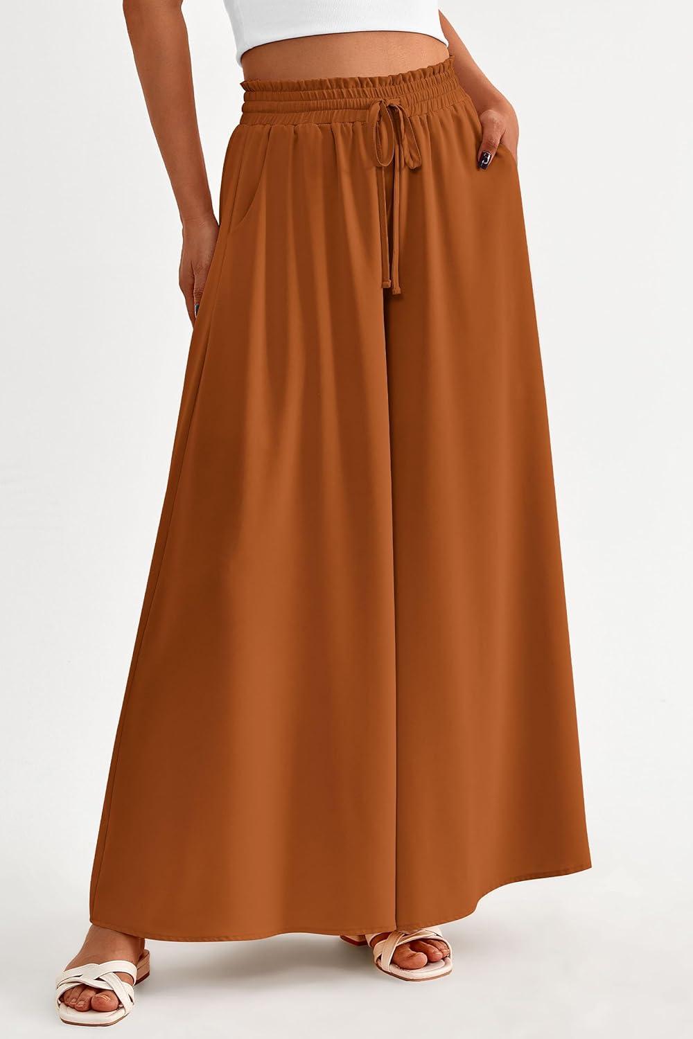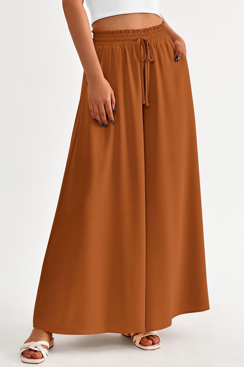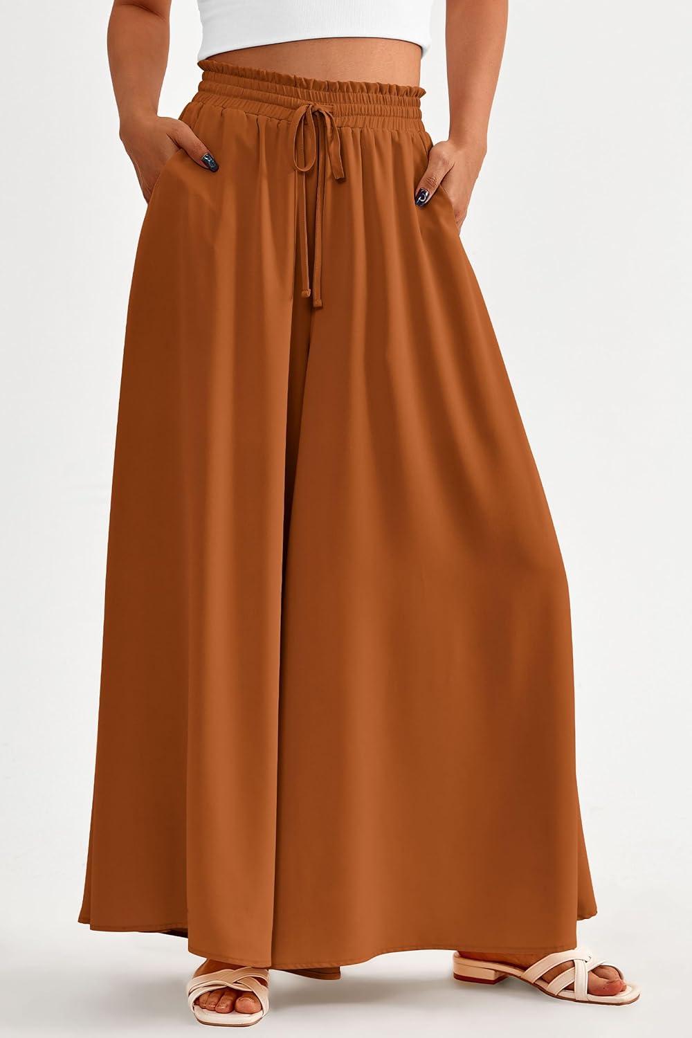 imagePRETTYGARDEN Womens 2025 Summer Wide Leg Palazzo Pants High Waisted Flowy Pockets Trendy Casual Lounge Boho Beach TrousersBrown
