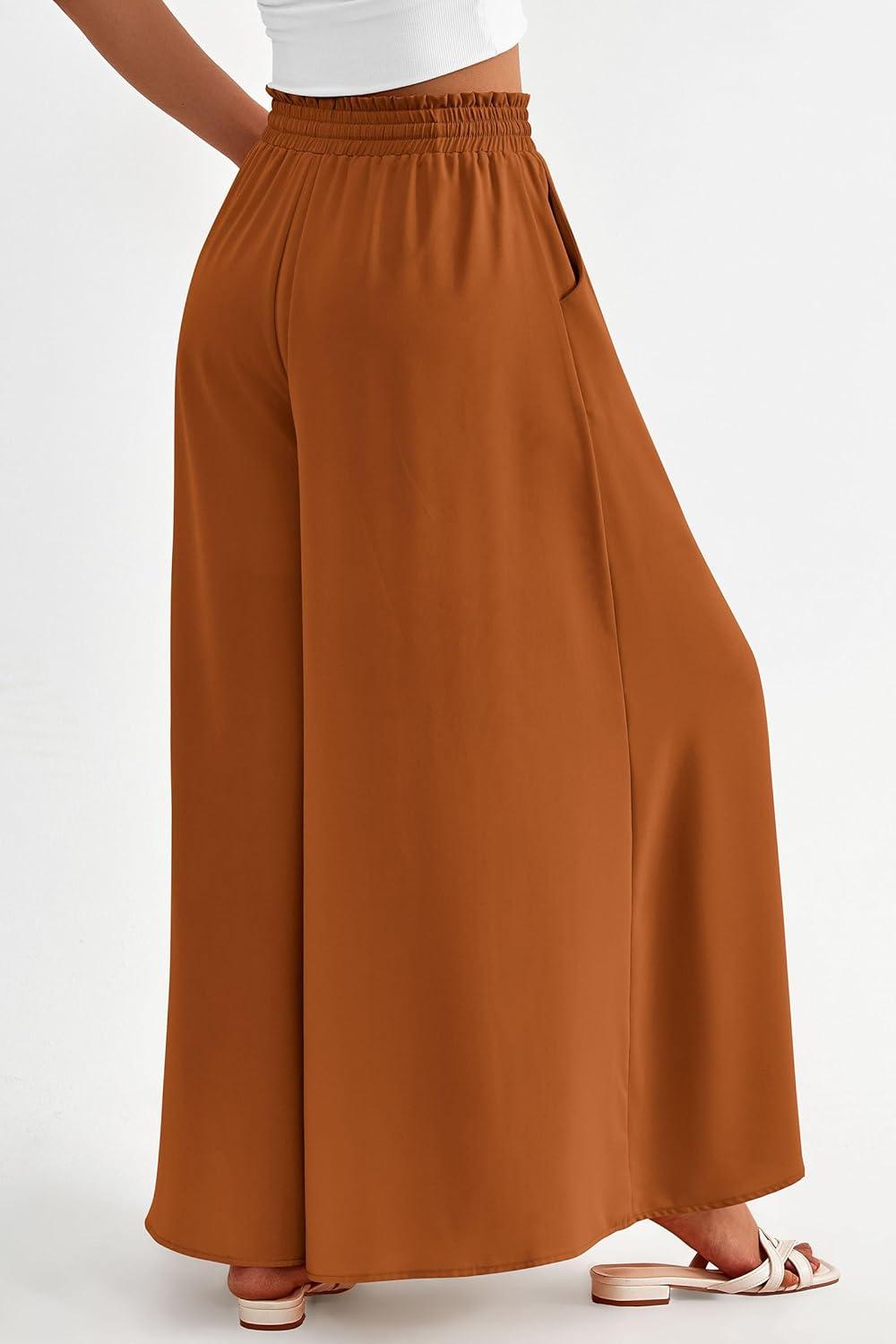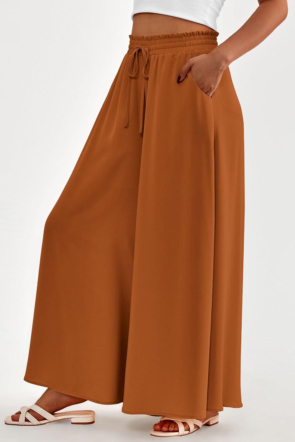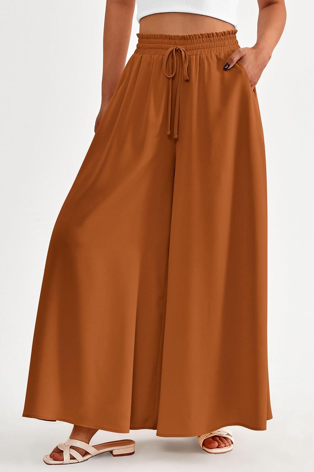 imagePRETTYGARDEN Womens 2025 Summer Wide Leg Palazzo Pants High Waisted Flowy Pockets Trendy Casual Lounge Boho Beach TrousersBrown