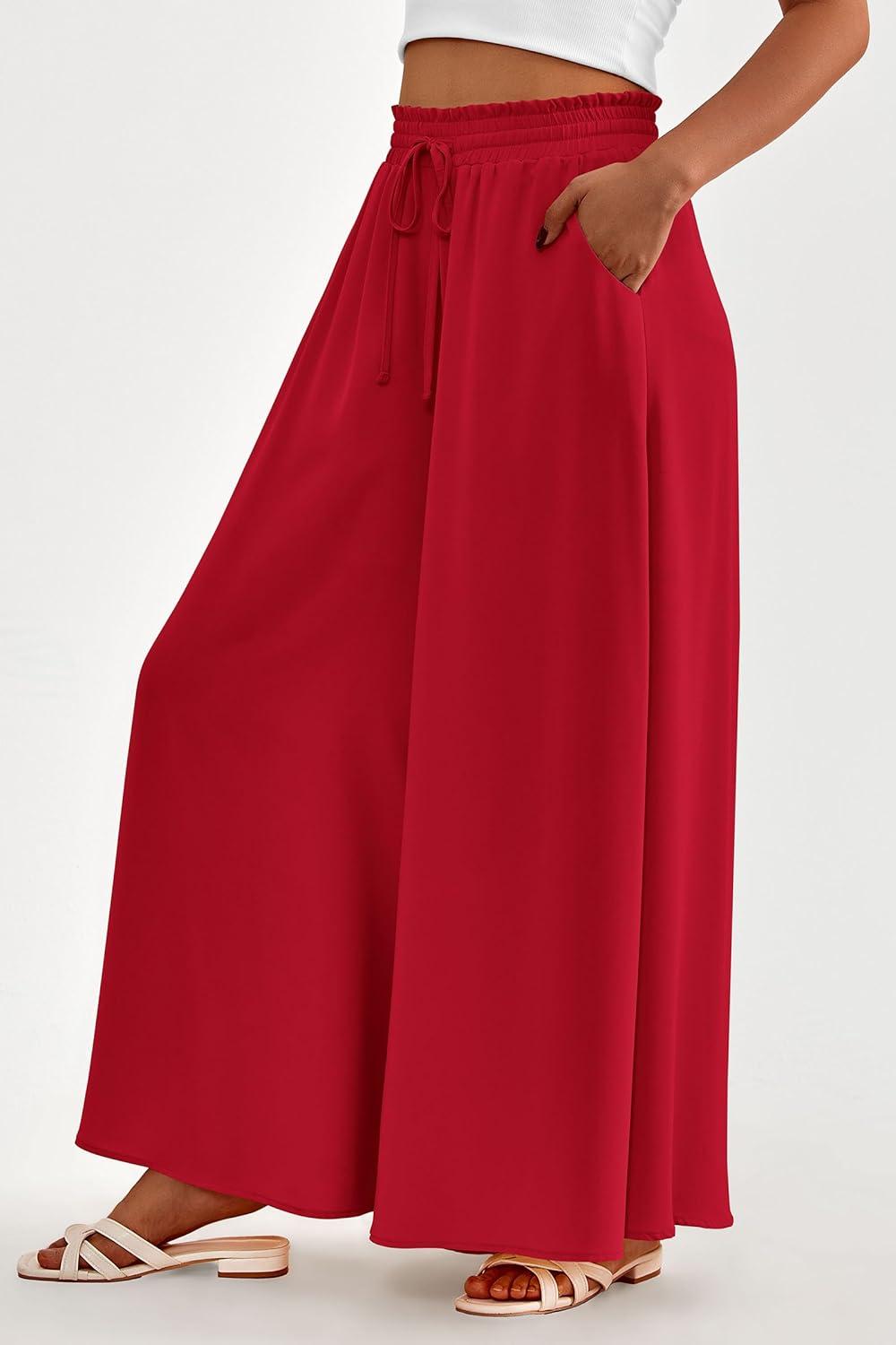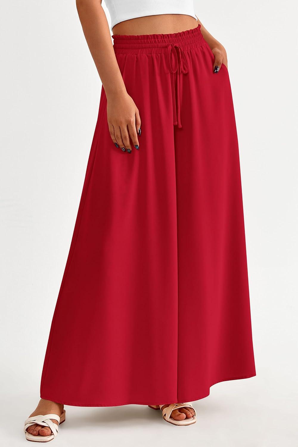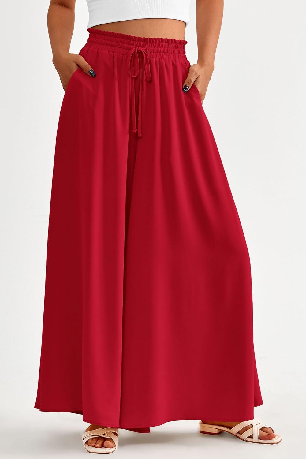 PRETTYGARDEN Women's 2025 Summer Wide Leg Palazzo Pants High Waisted Flowy Pockets Trendy Casual Lounge Boho Beach Trousers(Red)