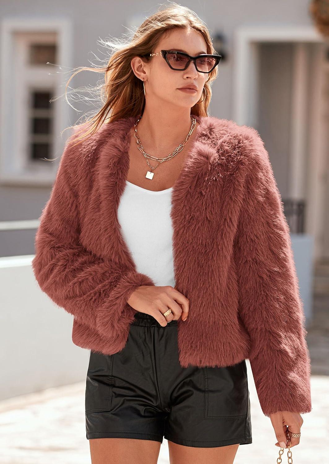 PRETTYGARDEN Women’s 2025 Winter Coats Fleece Cropped Jacket Faux Fur Long Sleeve Pockets Shaggy Warm Outerwear Fall Clothes(Pink)