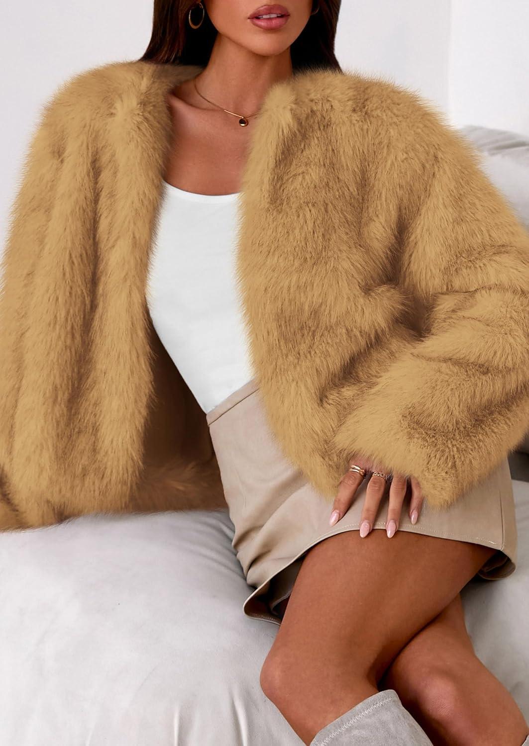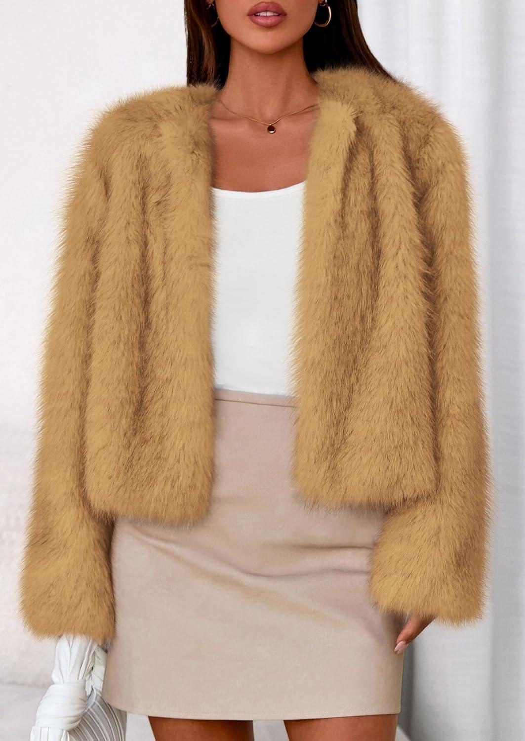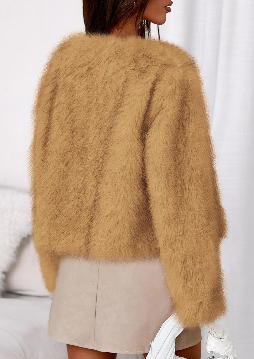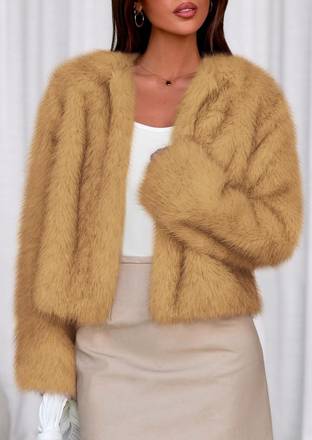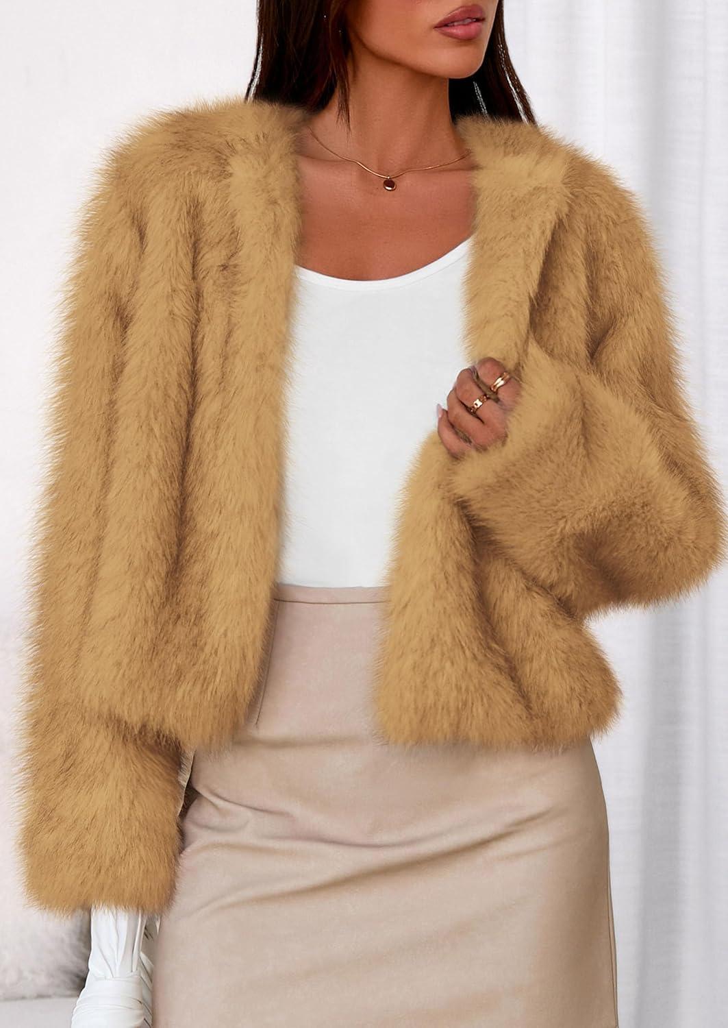 imagePRETTYGARDEN Womens 2025 Winter Coats Fluffy Cropped Faux Fur Jacket Long Sleeve Open Front Shaggy Outerwear Trendy ClothesYellow
