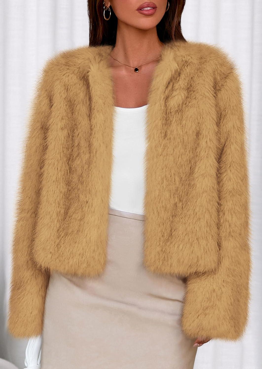 PRETTYGARDEN Womens 2025 Winter Coats Fluffy Cropped Faux Fur Jacket Long Sleeve Open Front Shaggy Outerwear Trendy Clothes(Yellow)