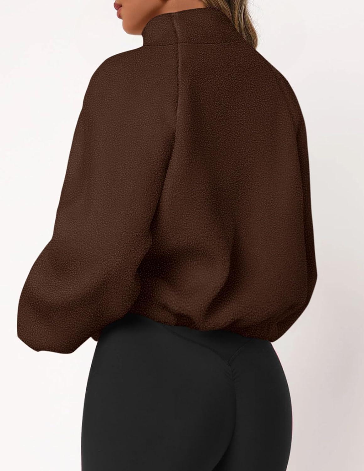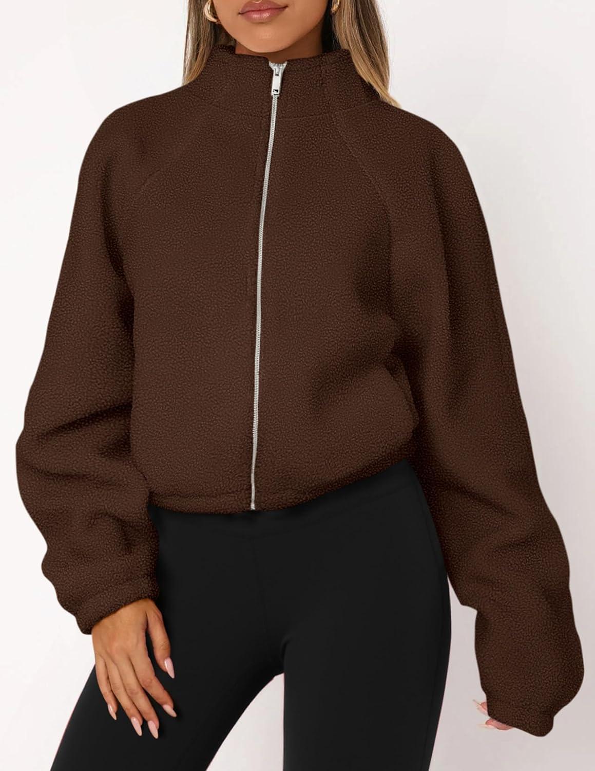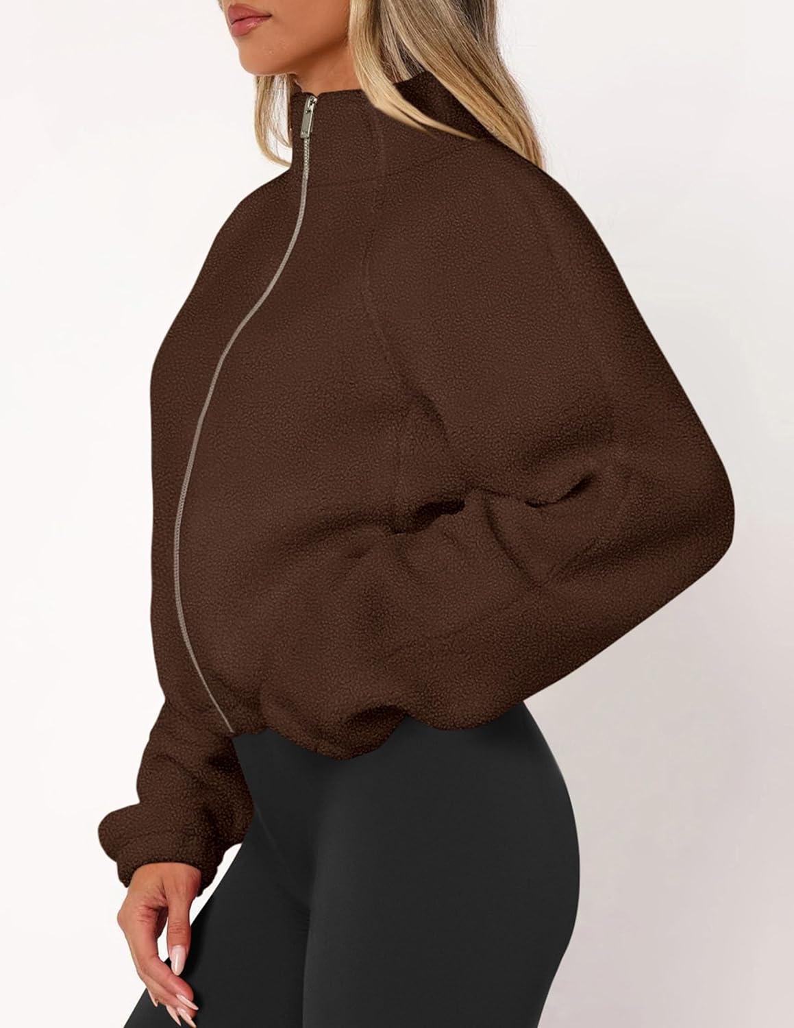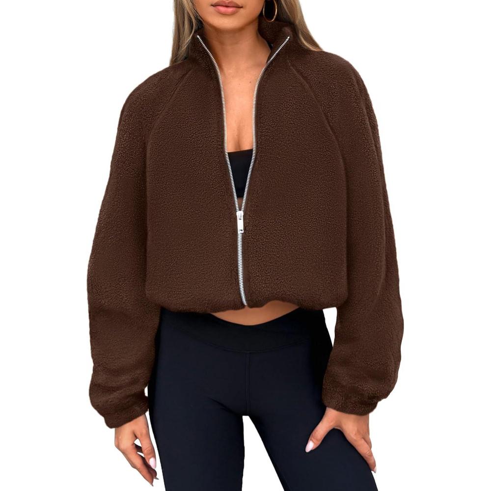 PRETTYGARDEN Womens 2025 Winter Fleece Sherpa Jacket Trendy Long Sleeve Zip Up Cropped Warm Coat Fall Fashion Workout Clothes(Brown)