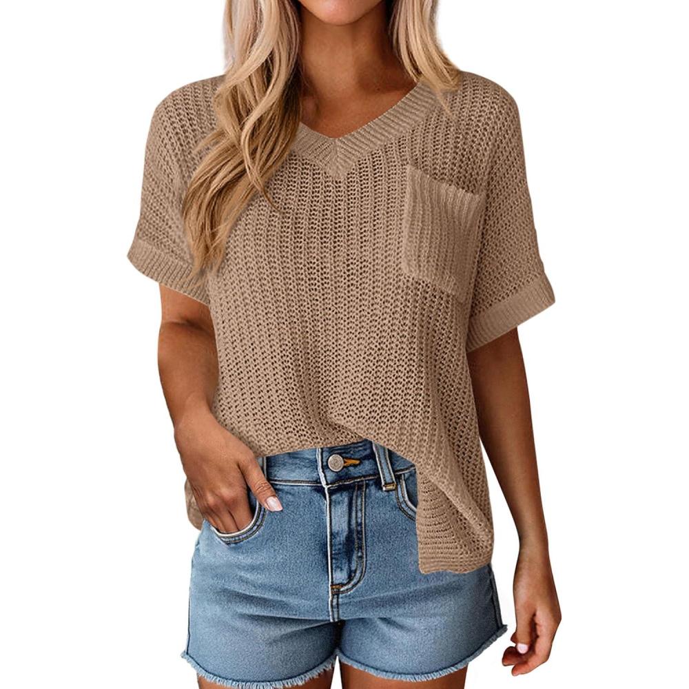 PRETTYGARDEN Women’s 2026 Spring Short Sleeve Sweaters Lightweight V Neck Casual Going Out Summer Tops Beach Vacation Clothes(Khaki)