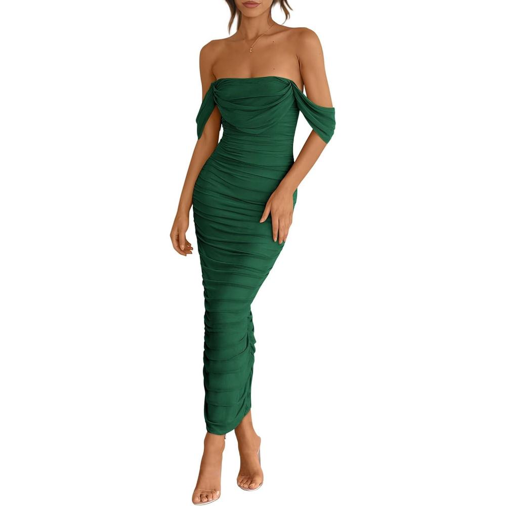 PRETTYGARDEN Womens 2026 Summer Off The Shoulder Dress Ruched Bodycon Sleeveless Split Cocktail Party Maxi Dresses(Dark Green)