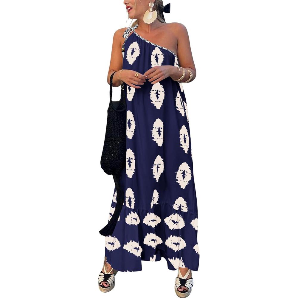 PRETTYGARDEN Women’s 2026 Summer One Shoulder Maxi Dress Printed Flowy Boho Long Sundresses Spring Beach Vacation Clothes(Navy Apricot Floral)