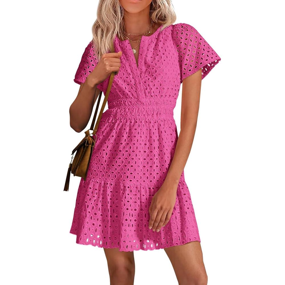 PRETTYGARDEN Womens 2026 Summer Short Dress V Neck Short Sleeve A Line Hollow Out Lace Ruffle Cute Casual Beach Party Dresses(Rose Red)