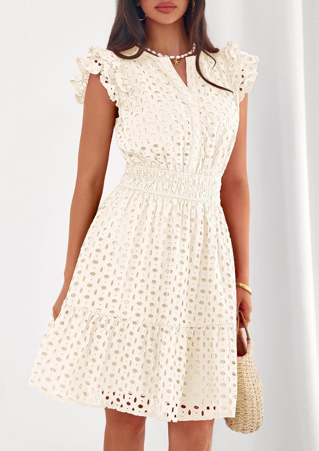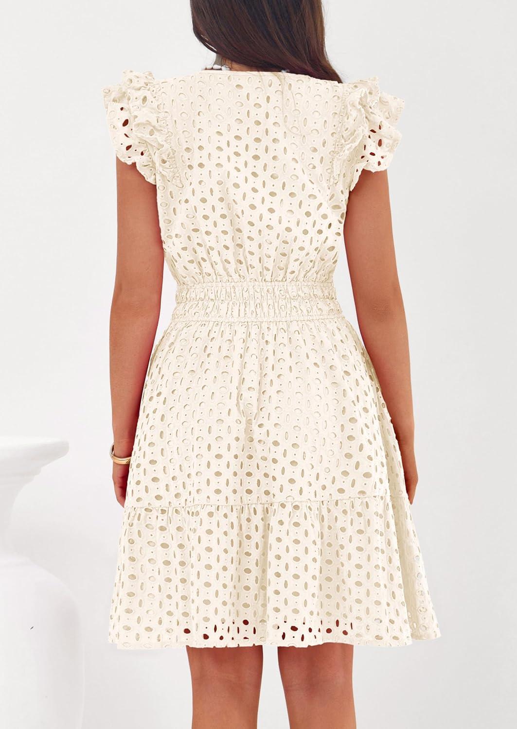 PRETTYGARDEN Women’s 2026 Summer Sundresses Eyelet Cap Sleeve V Neck Short Boho Wedding Guest Dress Beach Vacation Clothes(Beige)