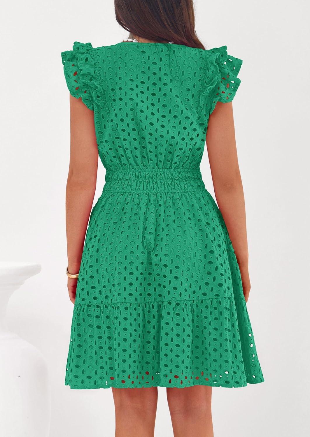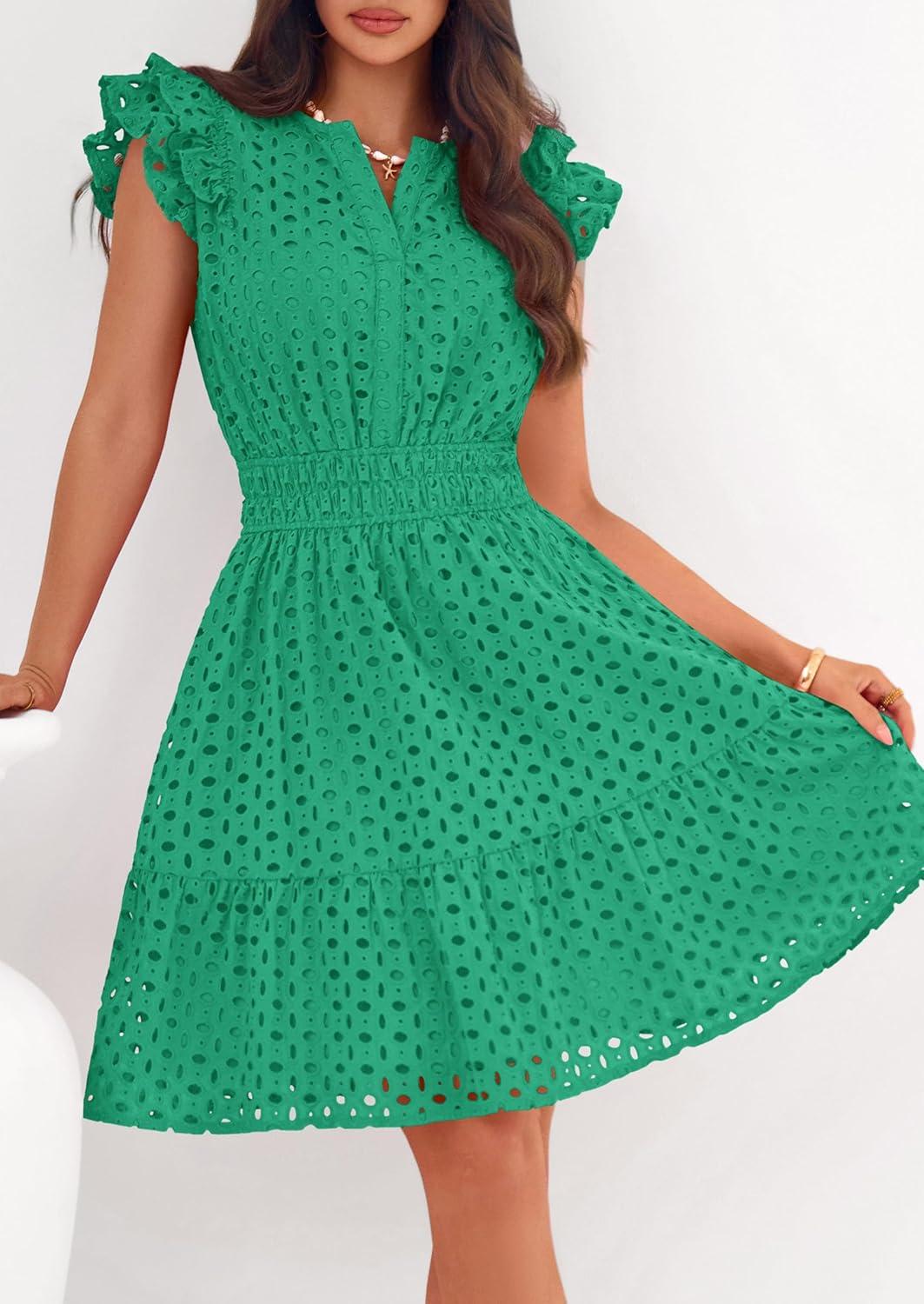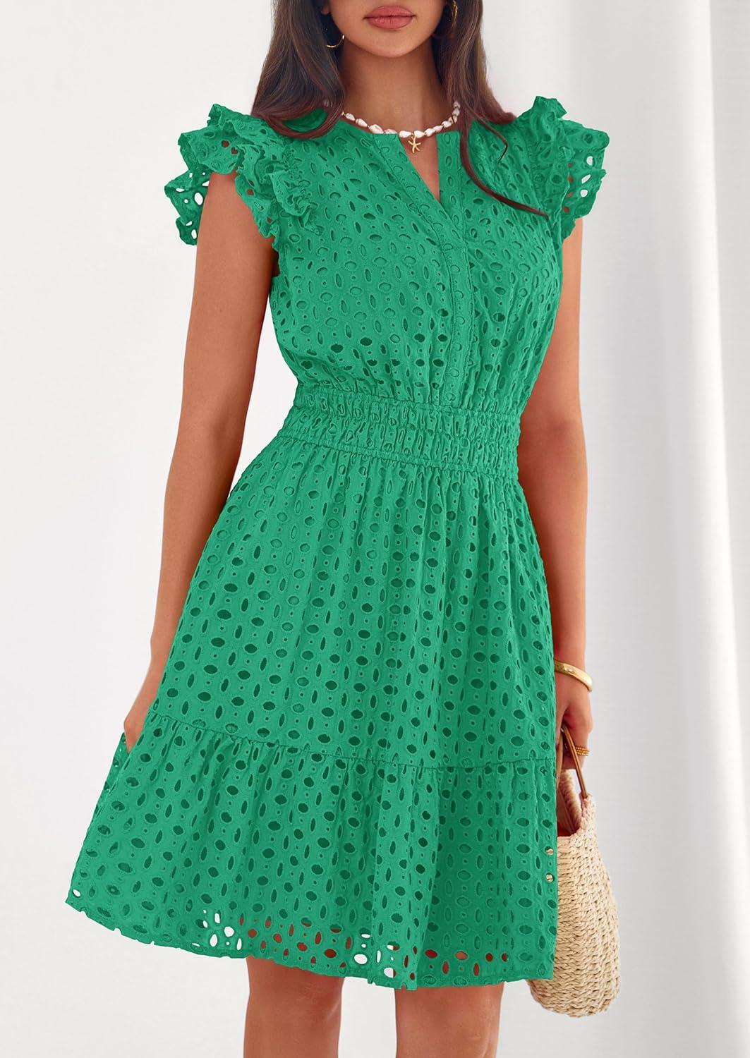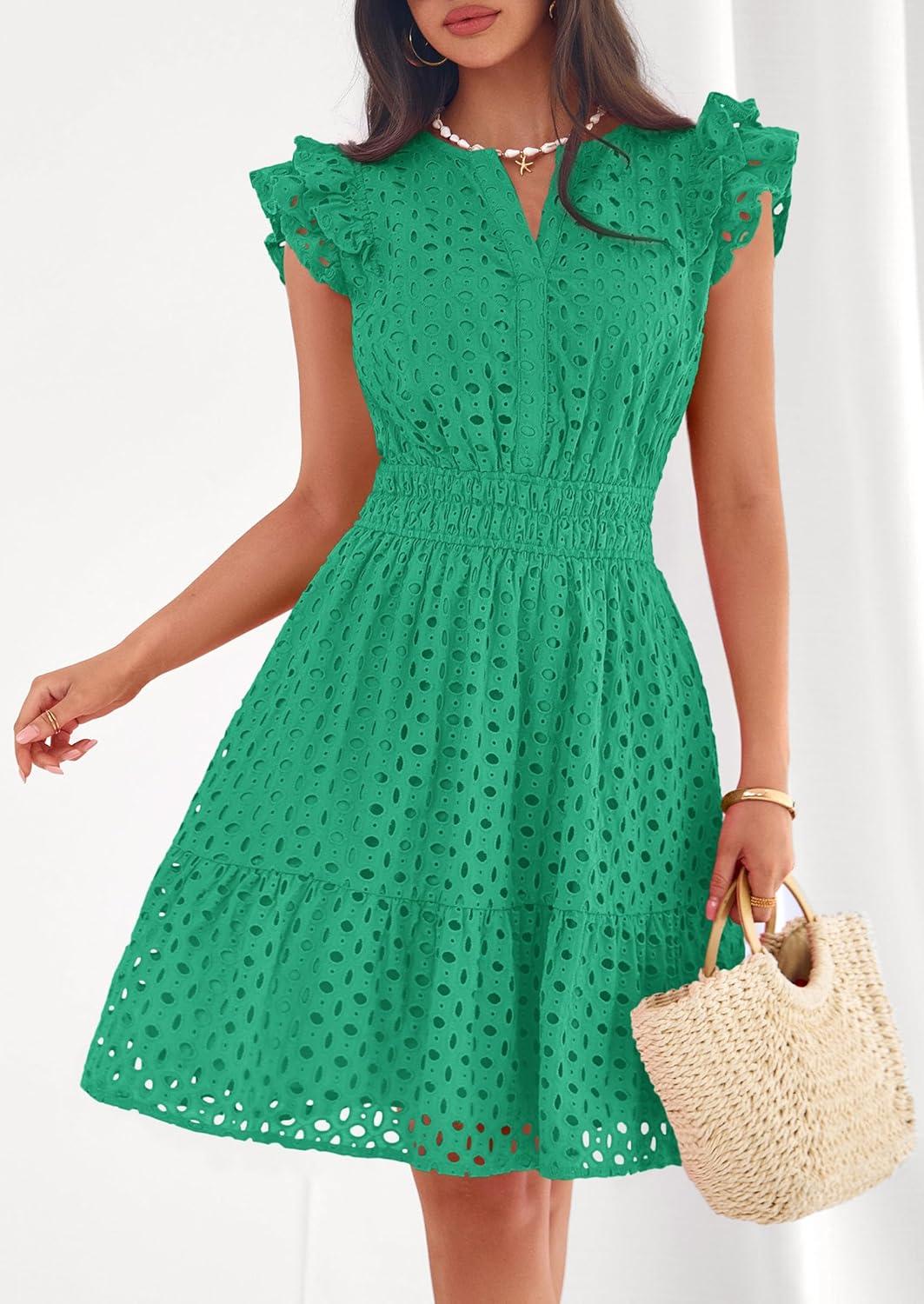 PRETTYGARDEN Women's 2026 Summer Sundresses Eyelet Cap Sleeve V Neck Short Boho Wedding Guest Dress Beach Vacation Clothes(Green)