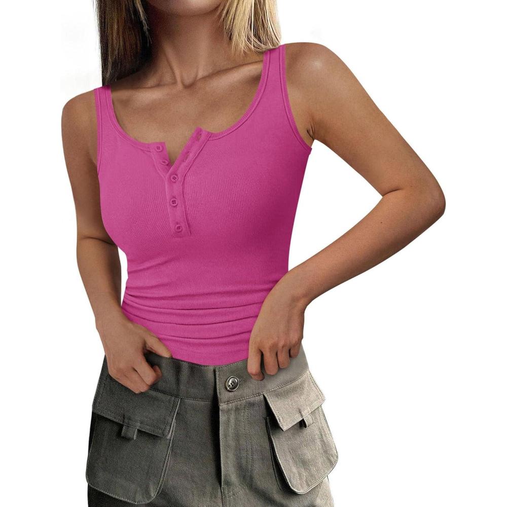 PRETTYGARDEN Womens 2026 Summer Tank Tops Ribbed Knit Slim Fit Sleeveless Henley Shirts Casual Basic Button Up Blouse(Rose Red)