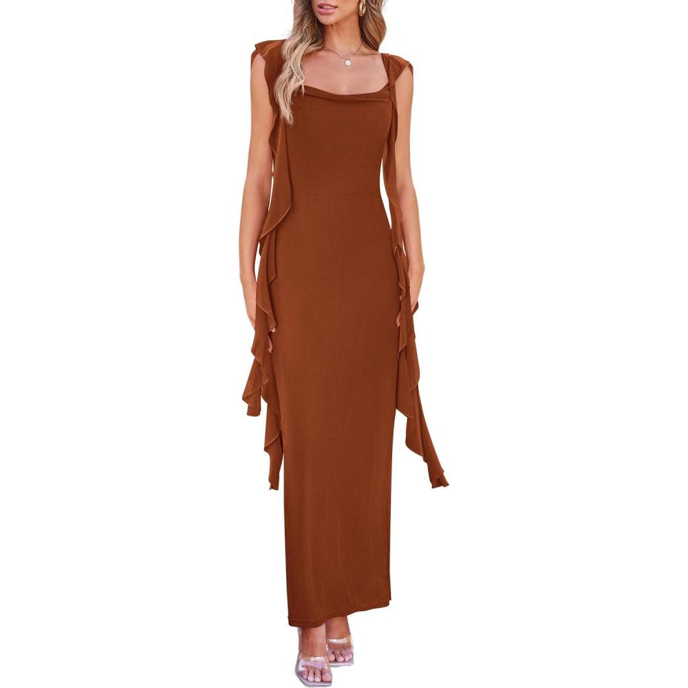 PRETTYGARDEN Women’s 2026 Summer Wedding Guest Dress Sleeveless Ruffle Formal Cocktail Party Maxi Bodycon Dresses(Caramel)