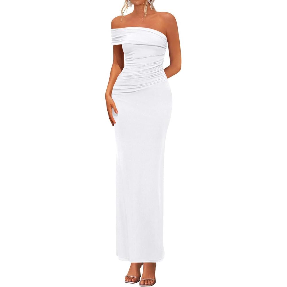 PRETTYGARDEN Women’s 2026 Wedding Guest Cocktail Dresses One Off The Shoulder Ruched Bodycon Formal Maxi Party Summer Outfits(White)