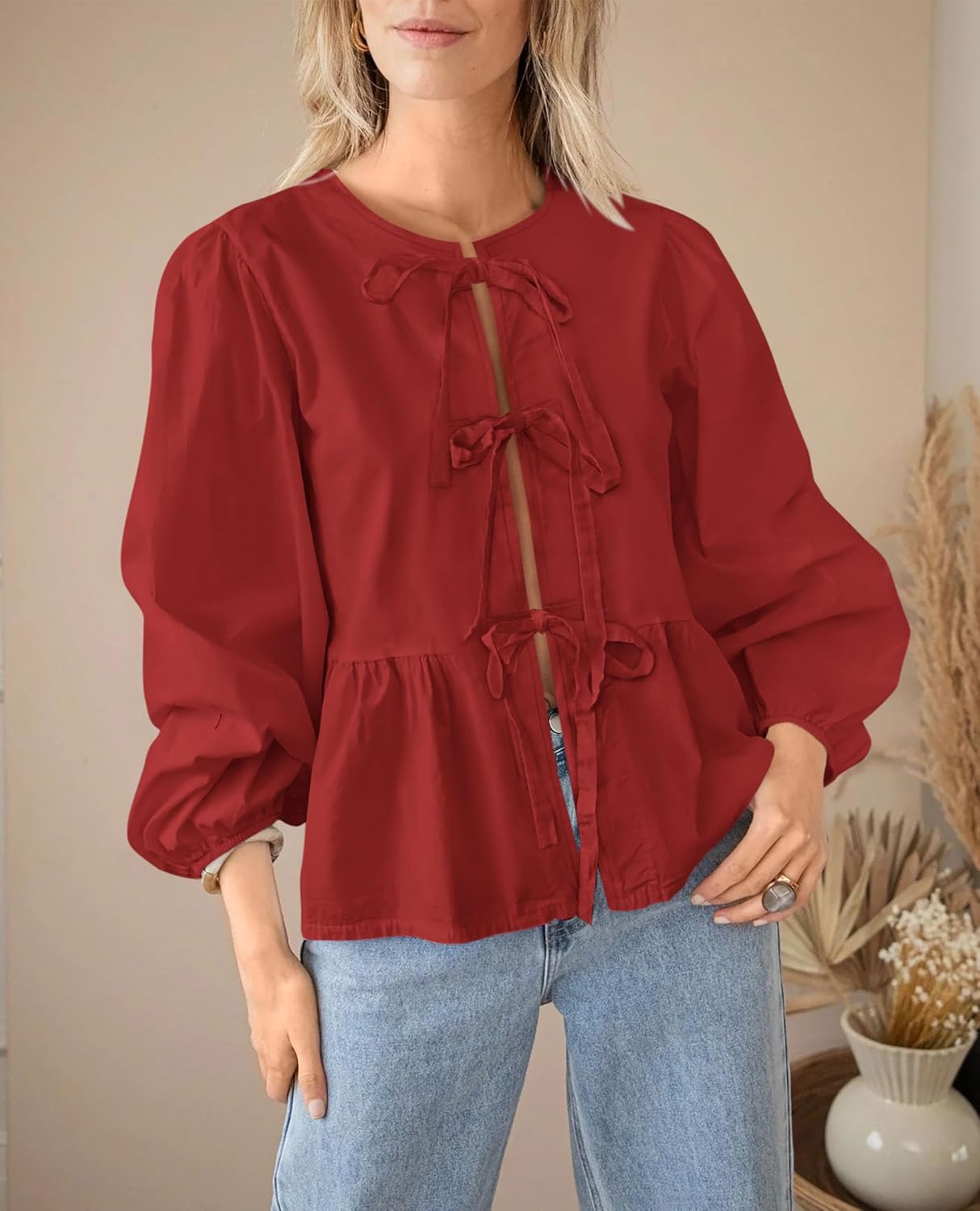 PRETTYGARDEN Womens Babydoll Peplum Blouse Shirt Puff Long Sleeve Bow Tie Front Trendy Cute Y2K Going Out TopsSolid Red