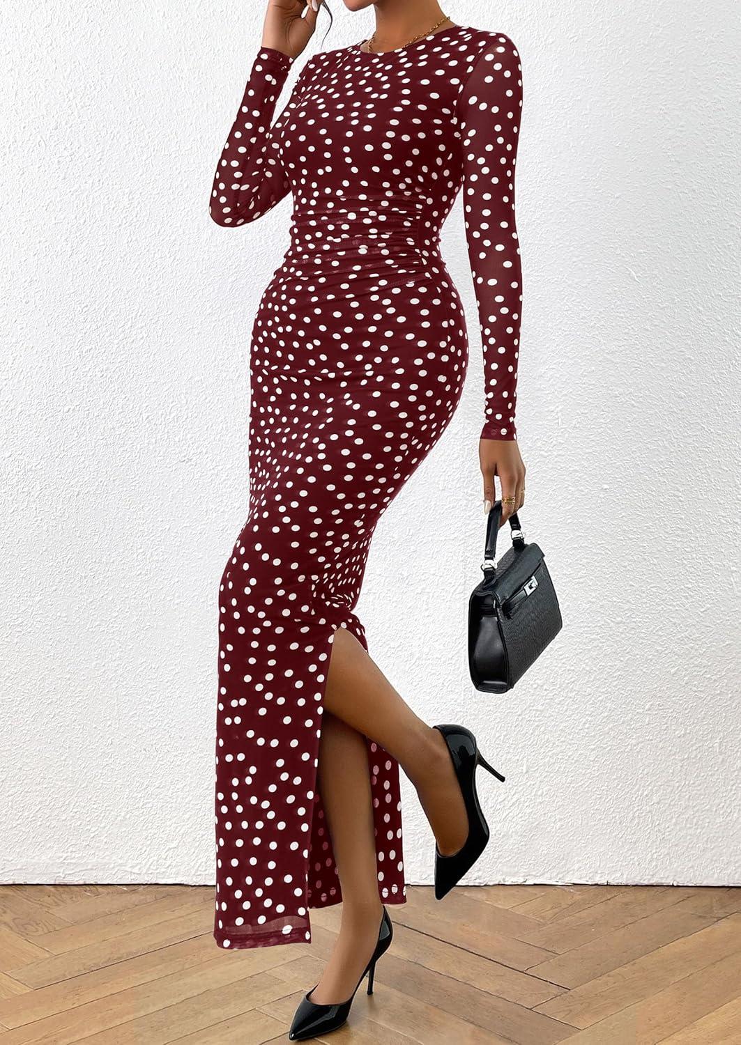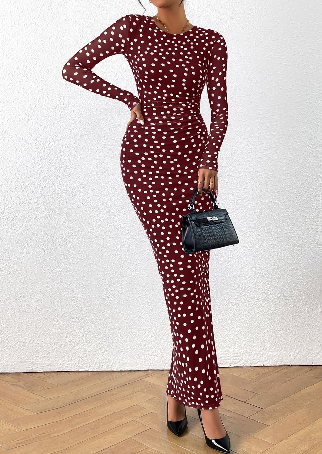 PRETTYGARDEN Women’s Bodycon Maxi Dress Fall Spring Fashion Long Sleeve Floral Print Tight Fitted Party Club Ruched Dresses(01 Polka Dot Red White)