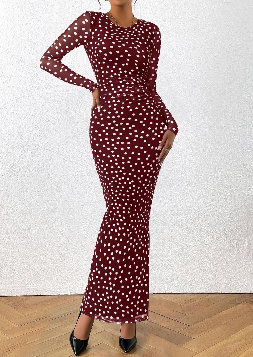 PRETTYGARDEN Women's Bodycon Maxi Dress Fall Spring Fashion Long Sleeve Floral Print Tight Fitted Party Club Ruched Dresses(01 Polka Dot Red White)