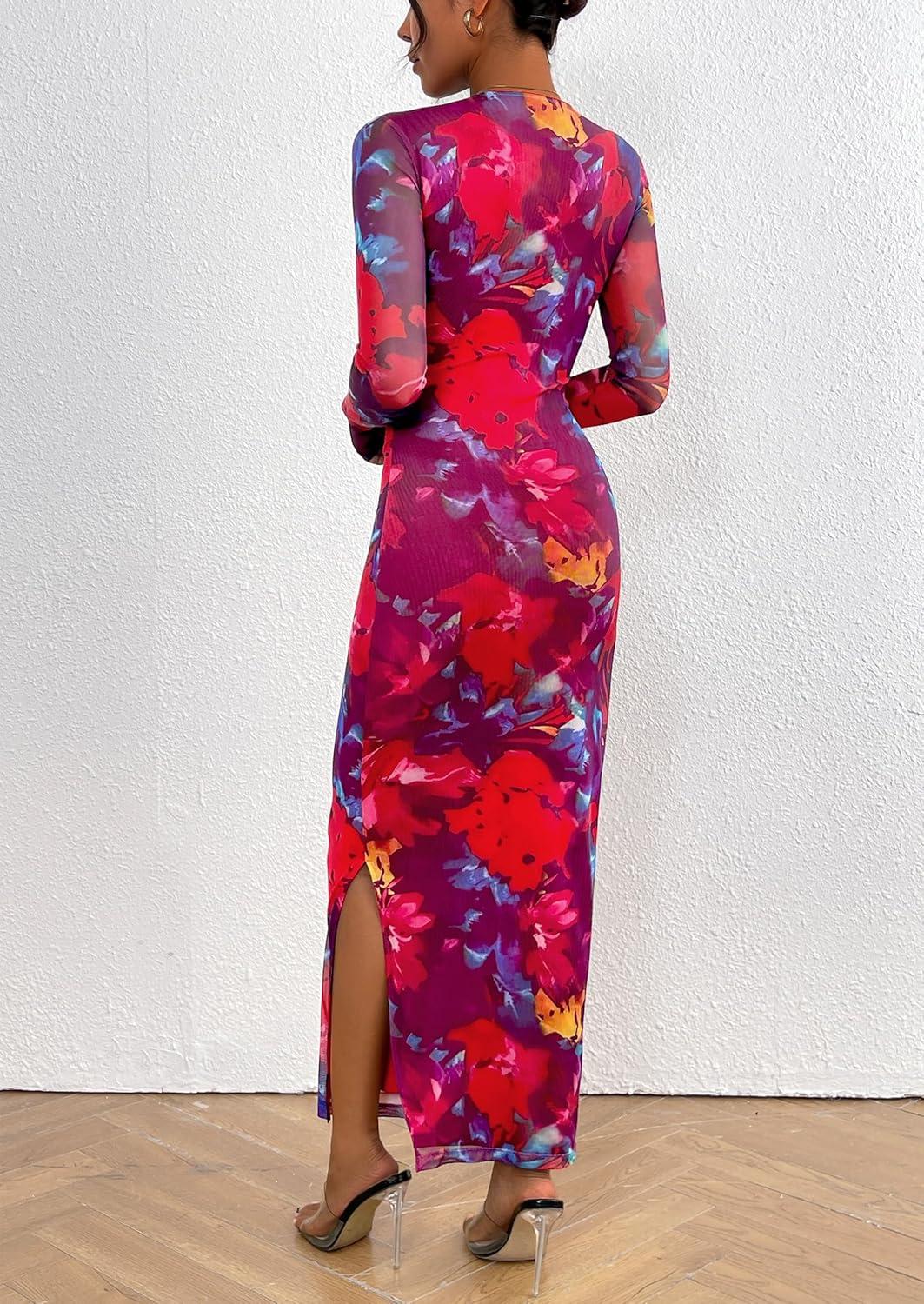 PRETTYGARDEN Women’s Bodycon Maxi Dress Fall Spring Fashion Long Sleeve Floral Print Tight Fitted Party Club Ruched Dresses(Navy Red Big Floral)
