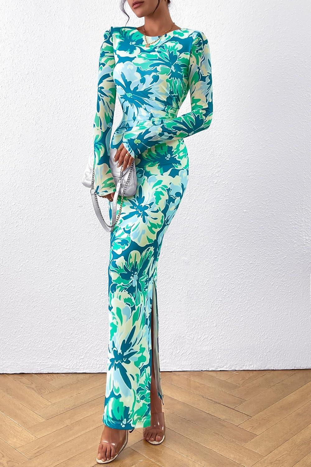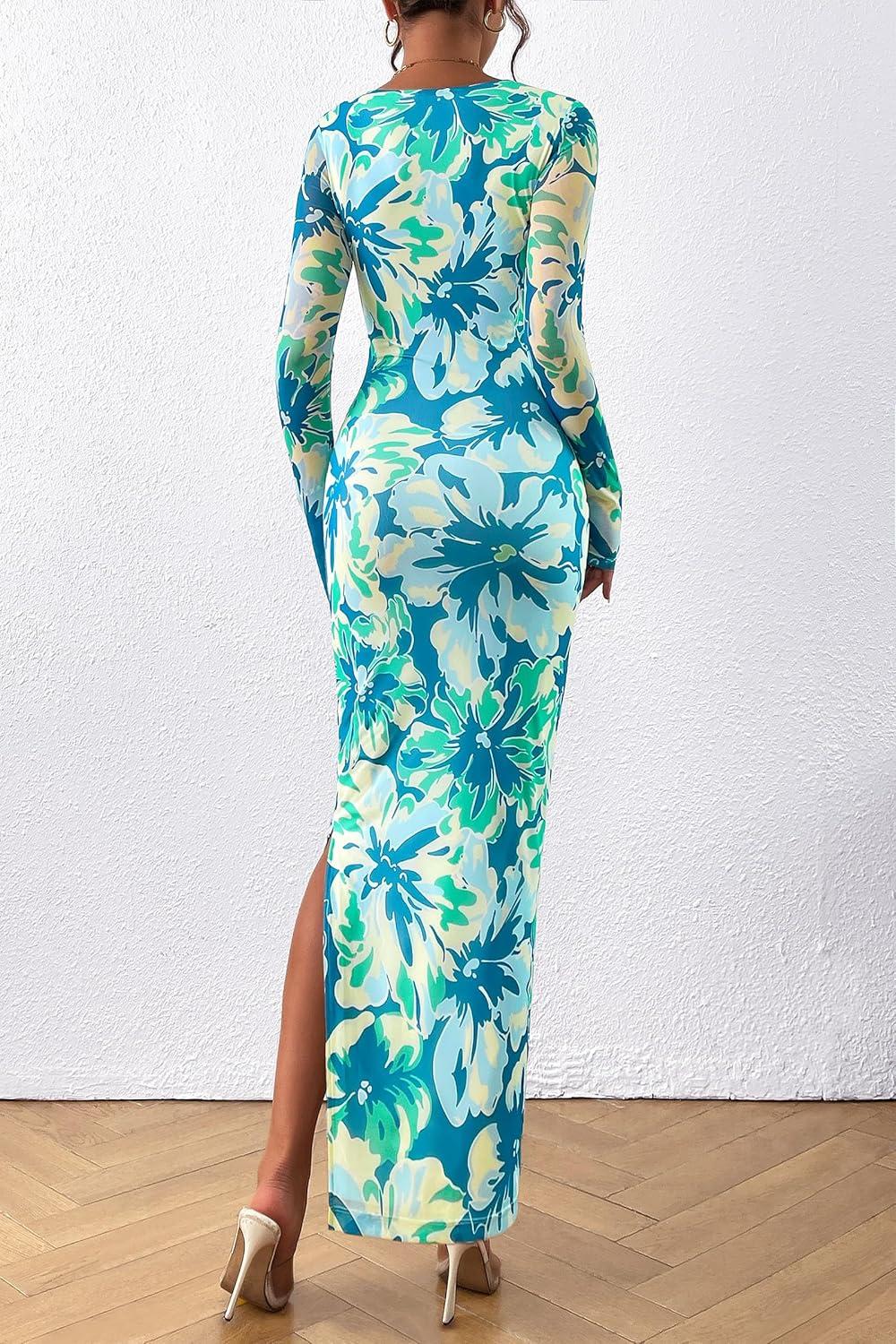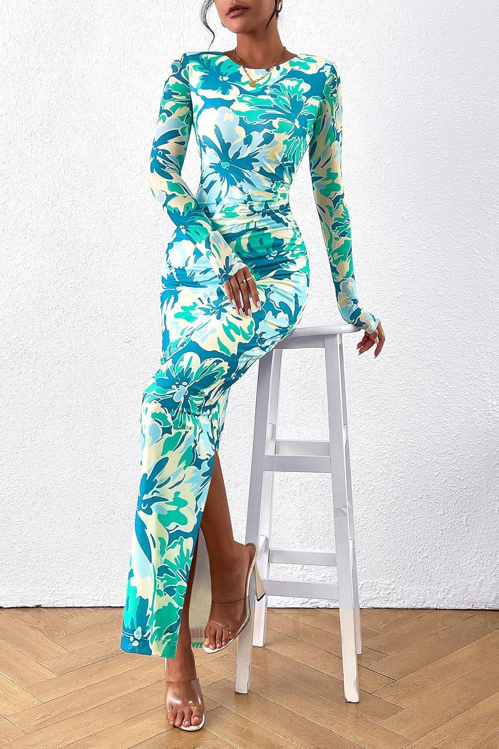 PRETTYGARDEN Women’s Bodycon Maxi Dress Fall Spring Fashion Long Sleeve Floral Print Tight Fitted Party Club Ruched Dresses(Print Blue Green)