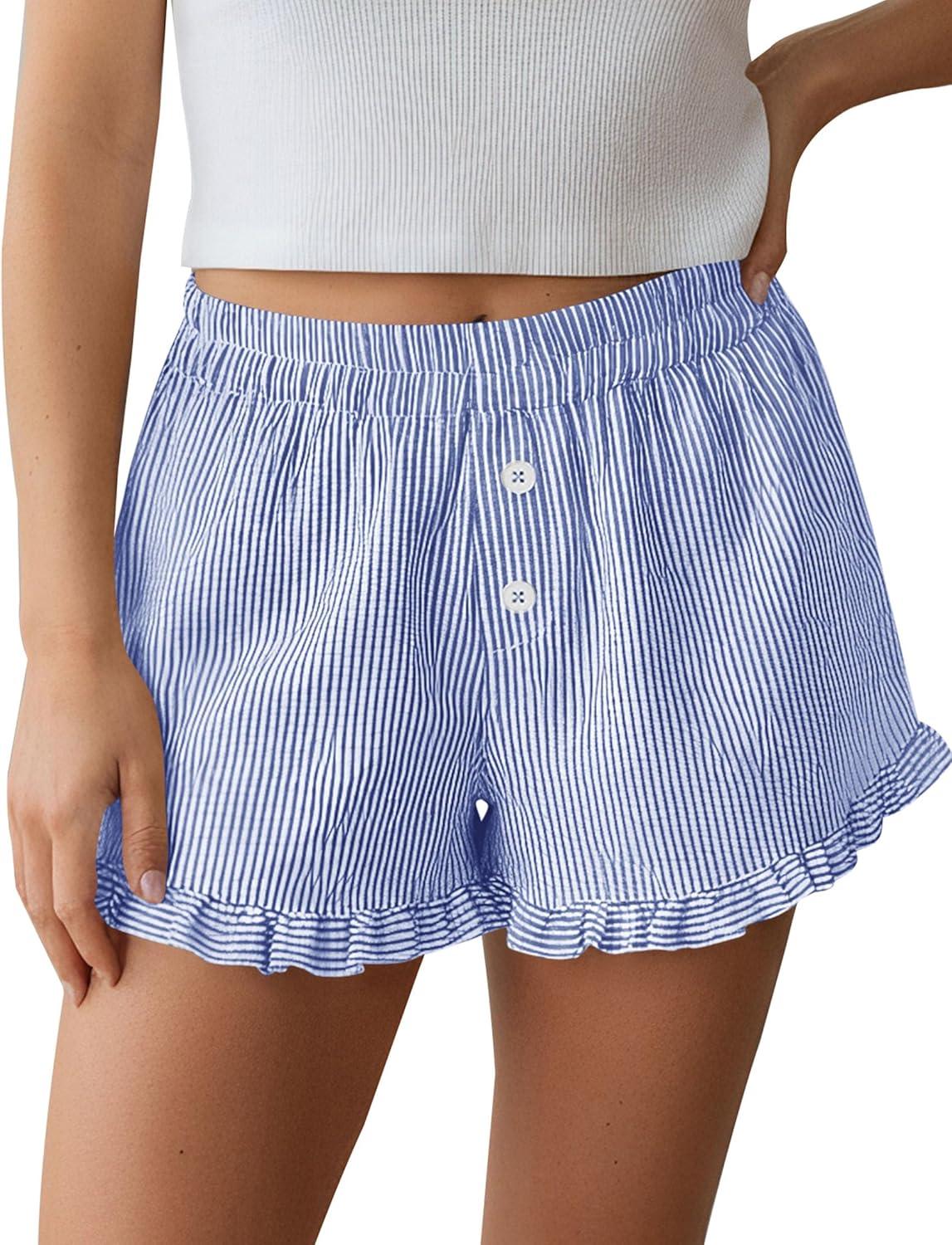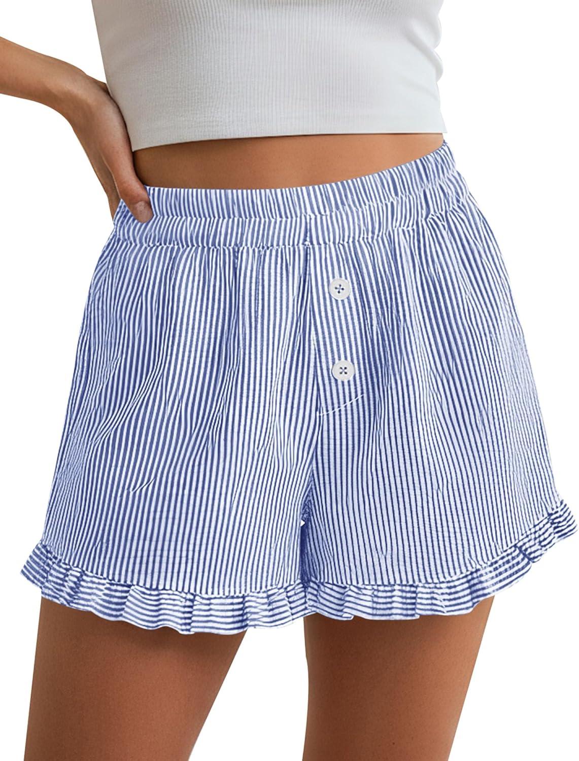 PRETTYGARDEN Womens Boxer Shorts Y2K Ruffle Pajama 2026 Summer Spring Lounge Sleep Striped Casual Beach Pj Bottoms Pockets(Stripe Blue)