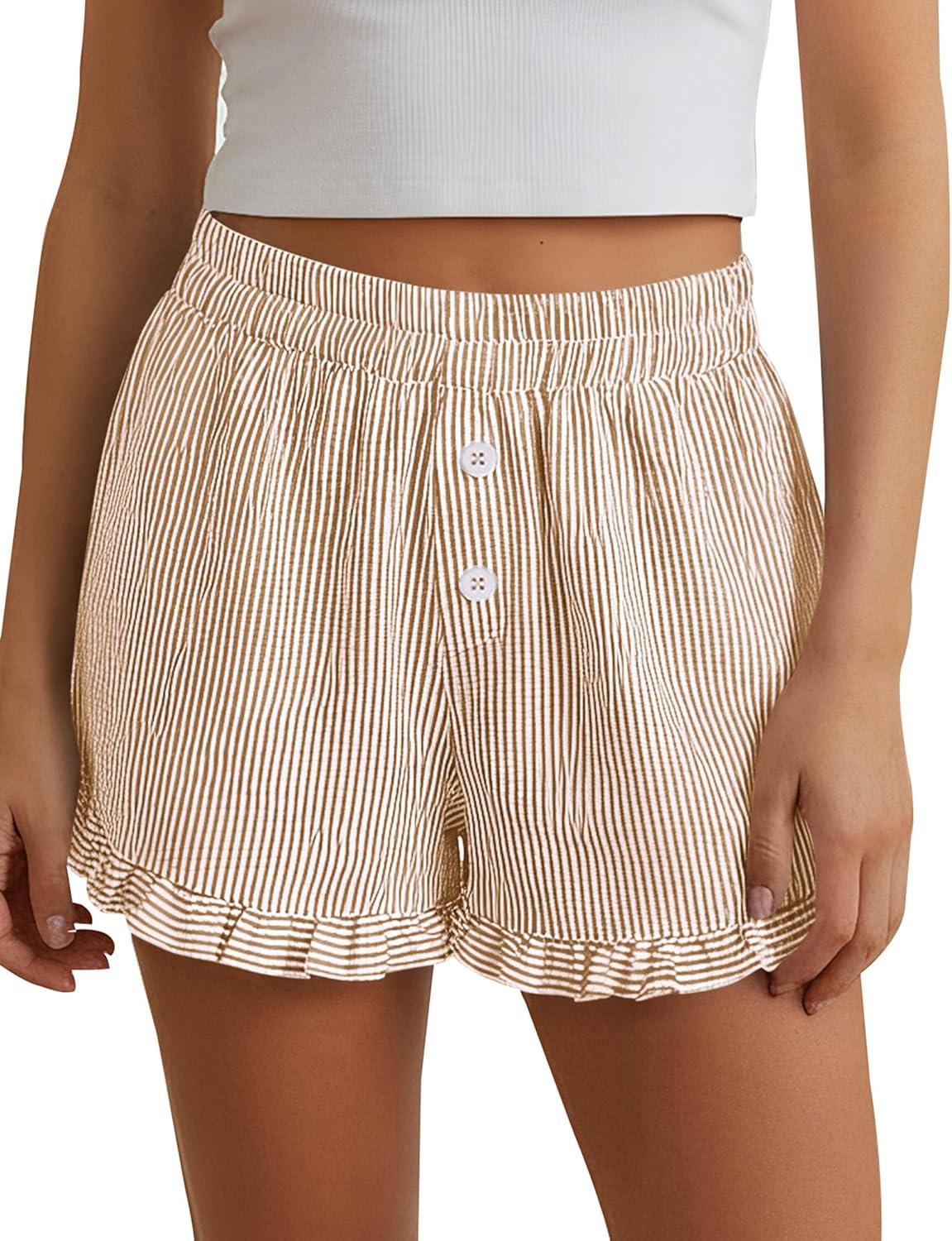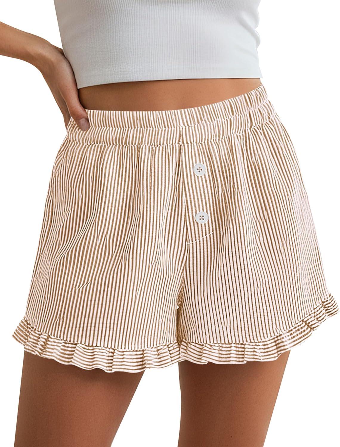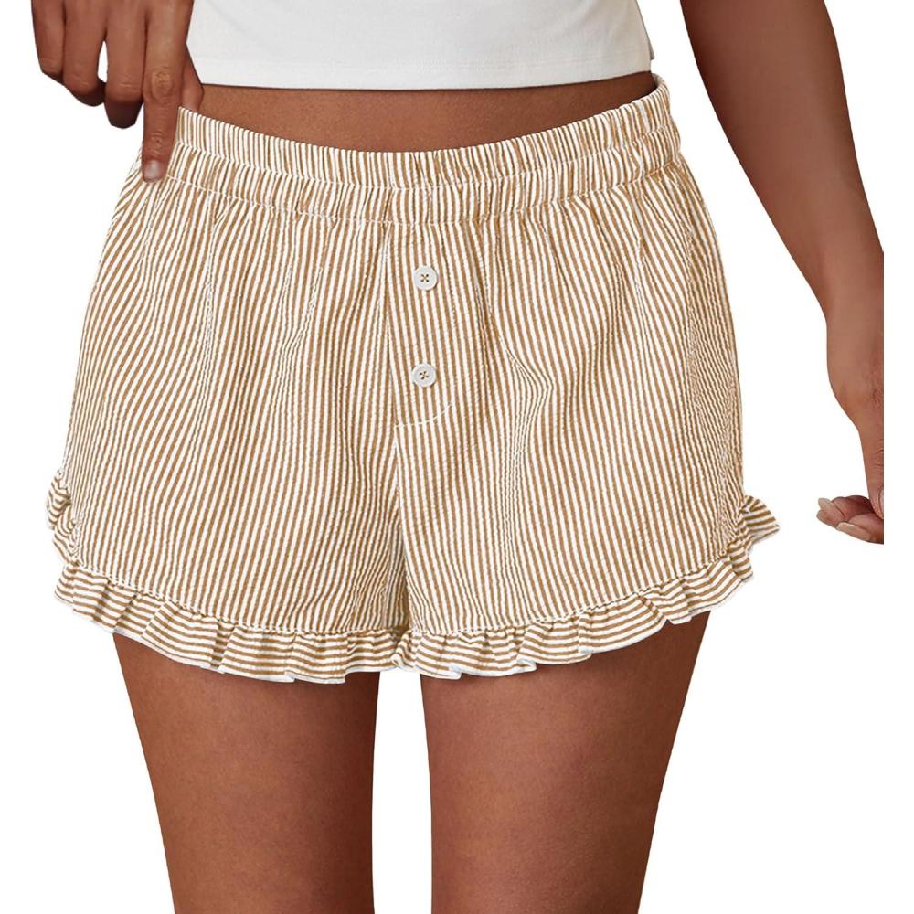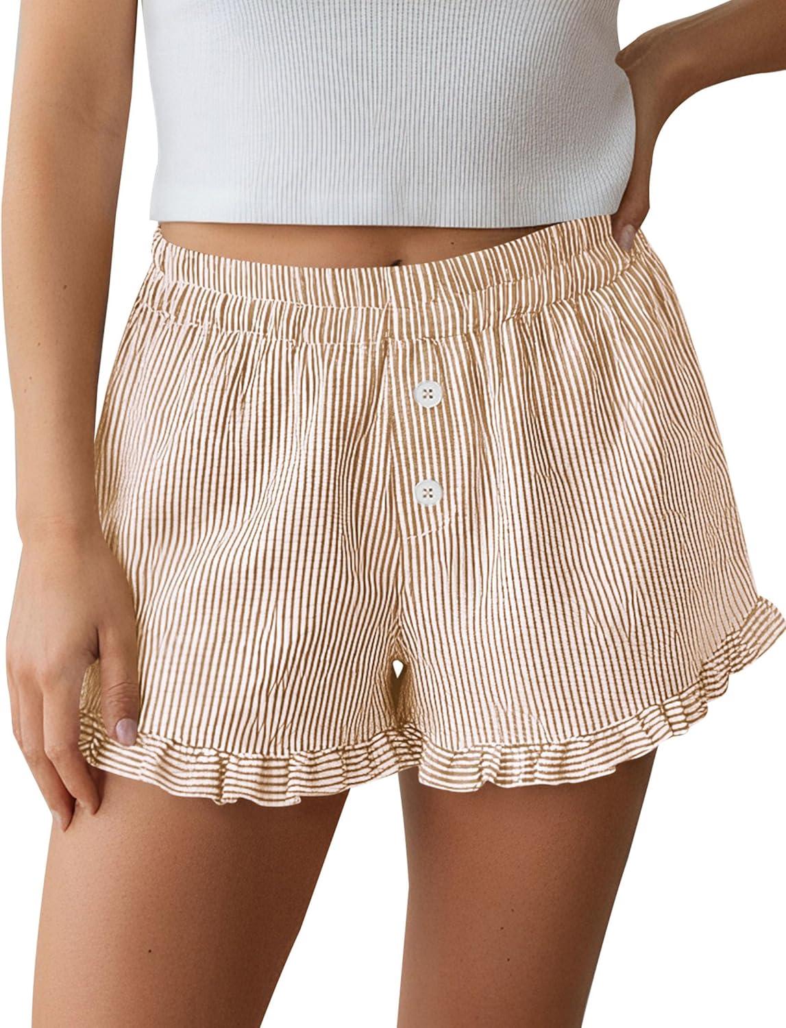 PRETTYGARDEN Womens Boxer Shorts Y2K Ruffle Pajama 2026 Summer Spring Lounge Sleep Striped Casual Beach Pj Bottoms Pockets(Striped Brown)