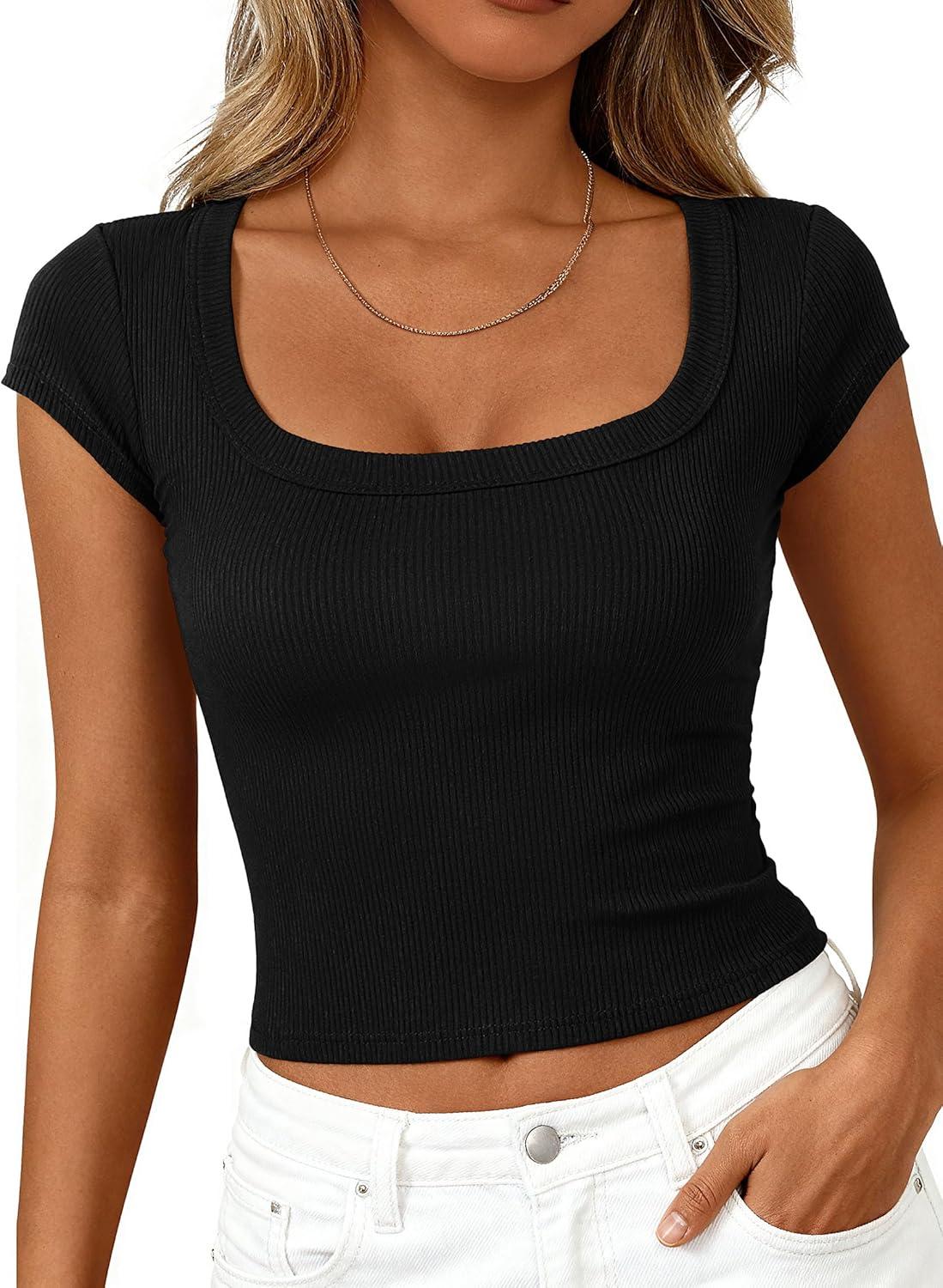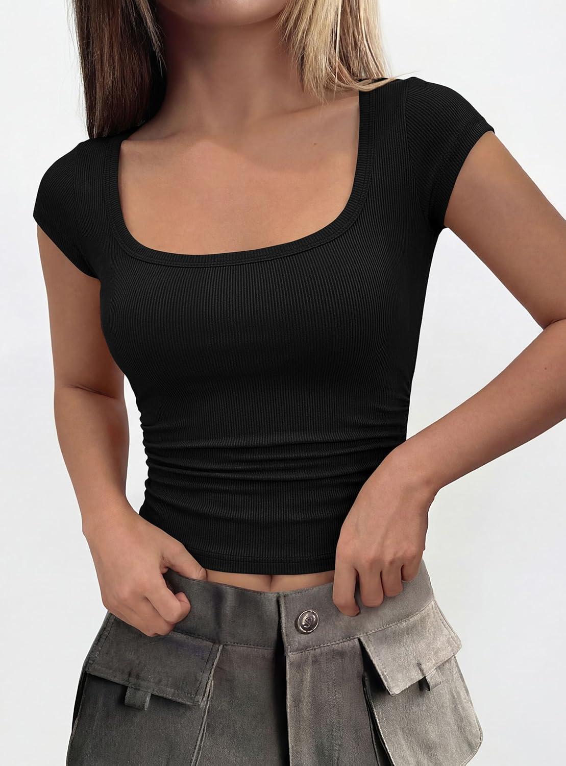 PRETTYGARDEN Womens Cap Sleeve T Shirts 2026 Square Neck Basic Tees Slim Fit Ribbed Knit Spring Going Out Tops Summer Clothes(Black)
