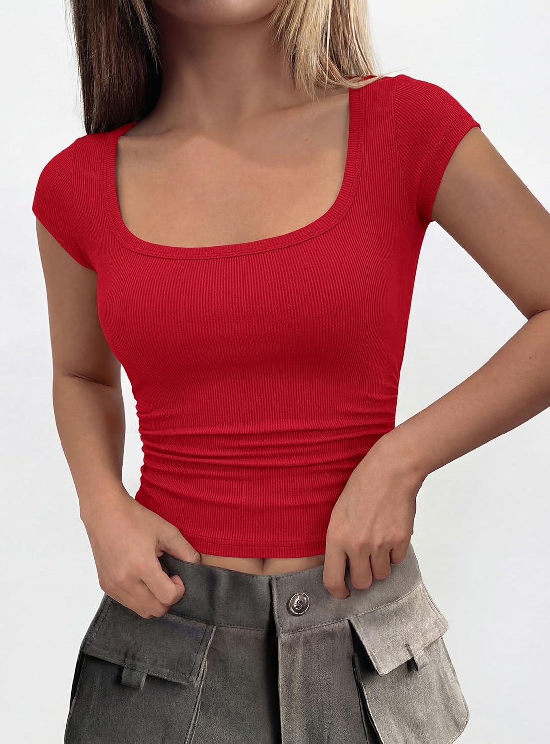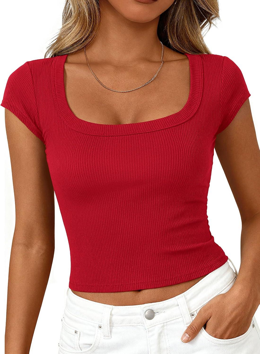 PRETTYGARDEN Womens Cap Sleeve T Shirts 2026 Square Neck Basic Tees Slim Fit Ribbed Knit Spring Going Out Tops Summer Clothes(Red)